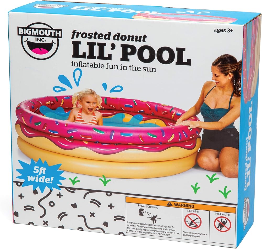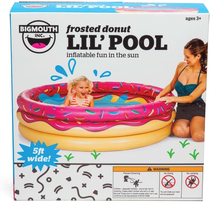 Unlike the unwieldy eyesores that so often describe kiddie pools, BigMouth Inc's Strawberry Donut Lil' Inflatable Kiddie Pool is easy on the eyes and a piece of donut to use. This 5' wide kid pool is built with a durable plastic that prevents small holes from tearing the material from normal use. It's spacious, but because the pool easily deflates, you don't have to worry about this product killing your grass or taking up too much space. The pool is meant to be stored over the winter, which prevents damage from icking up the bottom and sides. The bright colors and fun design of BigMouth Inc's fun plastic pools are an absolute must for imagination-heavy children. And the pool can be used for so much more than splashing around in water: get creative and use your donut to bob for apples, as a ball pit, build a frog habitat with your kids, play ring toss, include it in a backyard obstacle course, or lean into that lycanthropy and sit inside as you transform into a werewolf under a gleaming full moon. The possibilities are endless! Since their breakout at the International Toy Fair in New York in 2004, BigMouth Inc has been a leading manufacturer of fun, hilarious novelty products for all aspects of life, including vacation, drinkware, holiday gifts, home & office, holidays & special collections, yard decorations, mugs, money cans, and more. BigMouth's continued pursuit of quality has landed the company recognition through a slew of major players, including but not limited to The Tonight Show, Live! with Regis & Kelly, Buzzfeed, Forbes, Cosmo, and Bloomberg. Beware of counterfeits and knockoffs sold by other companies! Only "Sold by" BigMouth Inc products are guaranteed genuine. Please contact BigMouth Inc and Amazon immediately if you notice an unscrupulous dealer peddling replicas.