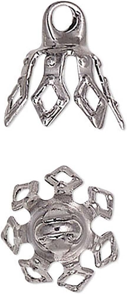 Transform your jewelry-making projects with these versatile bell cap findings. Perfect for beading enthusiasts and crafters, these bell caps have a ring at the top with a 1.5mm inner diameter so they can serve as elegant charm holders for beads, pearls, or crystals in your handmade jewelry pieces. The cap's distinctive bell shape measuring 7mm top to bottom creates a polished, professional finish while securely holding your beads in place with 5.5mm flexible legs. Whether you're creating necklaces, earrings, or bracelets, these findings add a decorative touch that elevates your designs. They're ideal for both beginners and experienced jewelry makers looking to enhance their creations with professional-looking components. These bell caps are excellent for customizing the look of your beads and creating unique jewelry pieces that stand out. Use them to add vintage charm to modern designs or create classical pieces that never go out of style. Keep these essential findings in your crafting supplies for whenever inspiration strikes. Package of 50 bell cap findings.