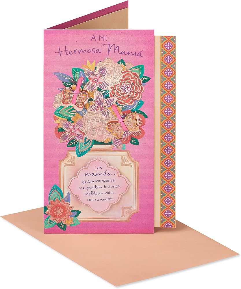 Your mother is a treasure, let her know how grateful you are for everything's she's done for you with this beautiful Spanish language Mother's Day card from American Greetings! The card features a richly painted floral design in vivid reds and pinks against a soft green textured background. It also comes with a delicate heart-shaped charm complete with ribbon that makes a lovely keepsake. The message is filled with gratitude, respect, and love, a fitting tribute to a woman who's like no other! From our Hispanic line, La Rosa. English translation on the back of card. Pink envelope included.