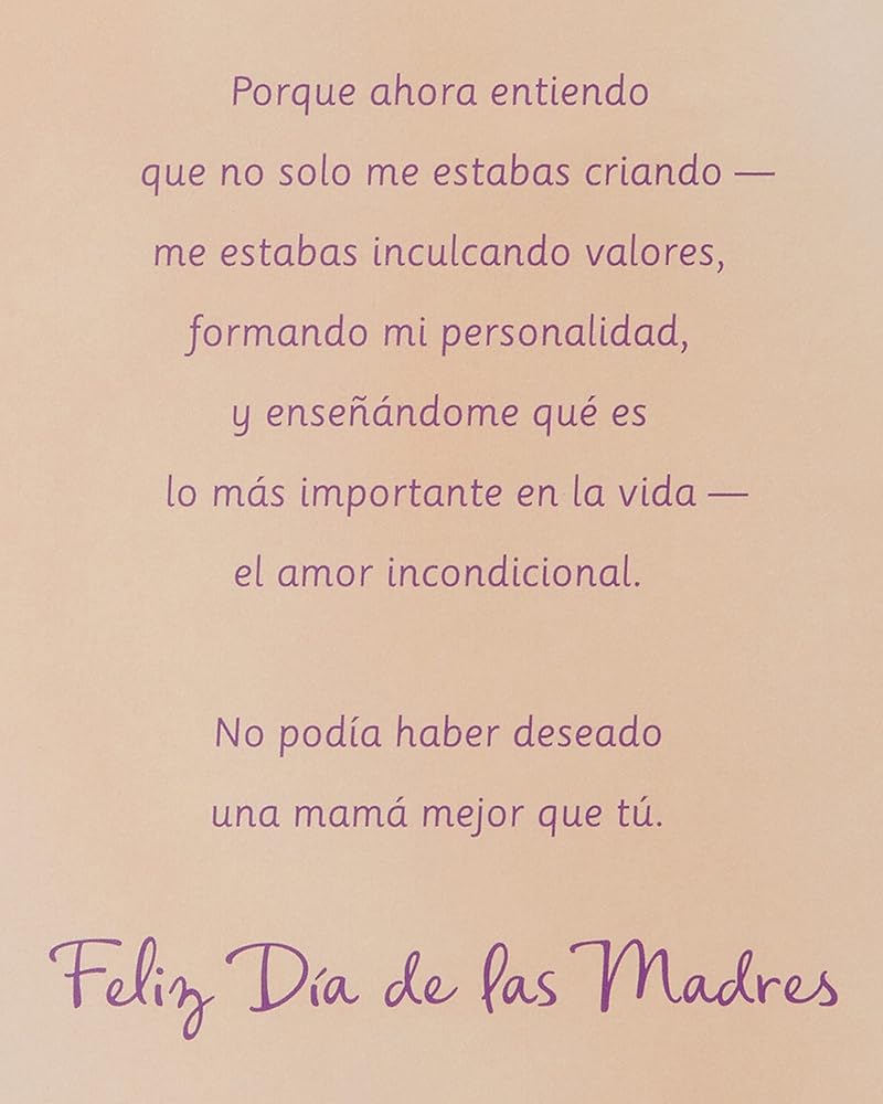 Front Message: Para Mi Madre Un Recuerdo con Mucho Mientras crecía, no tenía idea de tus sacrificios, de las tantas responsabilidades y labores que desempeñabas a diario. Solo sabía que me querías. Solo sabía que tenía una buena madre.