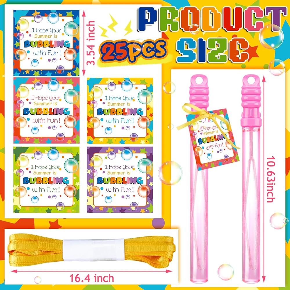 • Enriching Gift for Special Occasions: packaged as 25 bubble toys, 25 cards, and 1 roll of yellow ribbon, the set makes for a fantastic year end gift; Be it graduation parties, summer parties, or carnivals; This versatile set is sure to be a hit