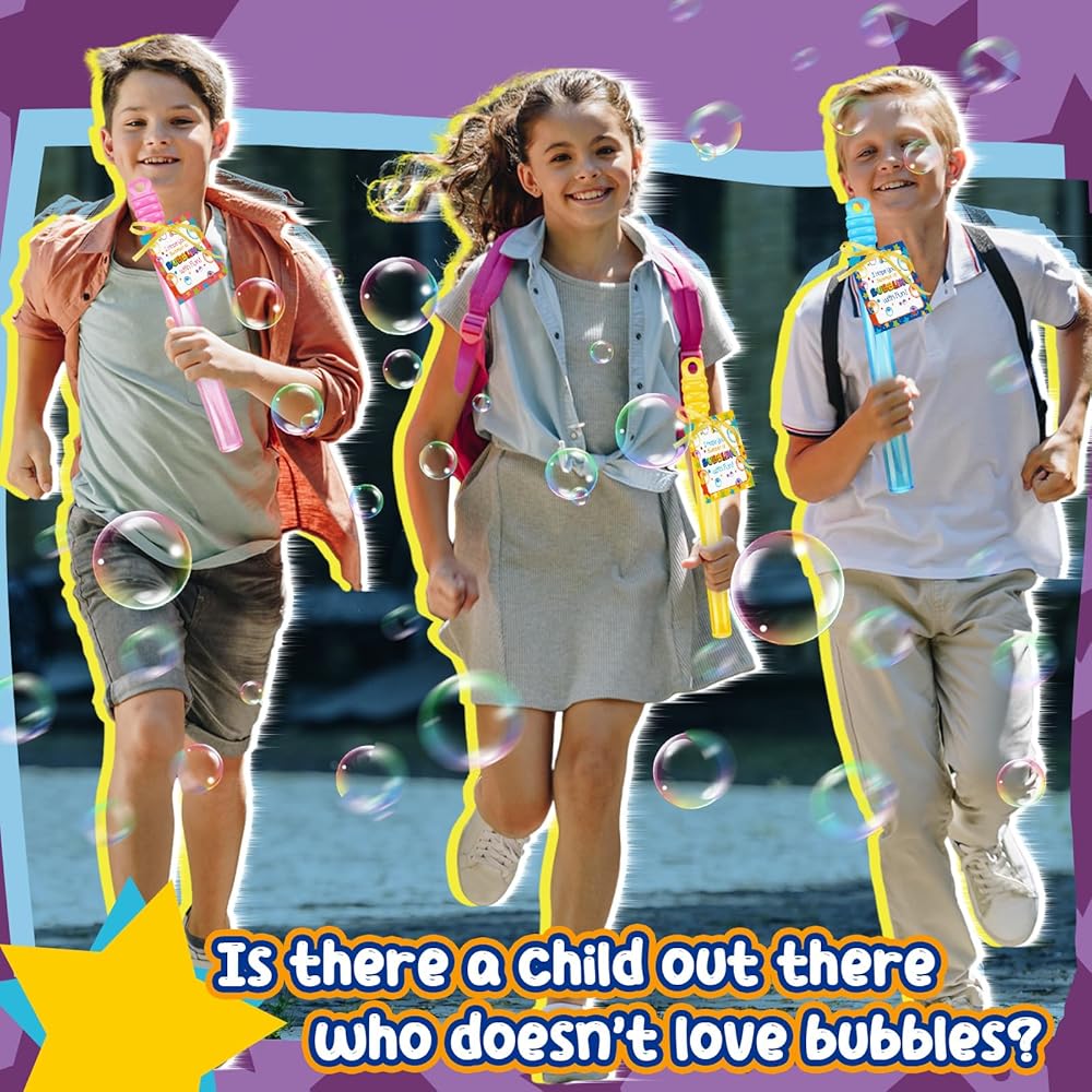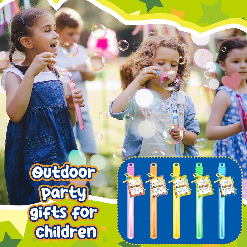 • A Bubbly Surprise: a year end surprise at your fingertips; This bubble wands bulk is the suitable gift to cap off the year; Make the gift more nice, thanks to the included cards and ribbon; A true bubble wonderland awaits