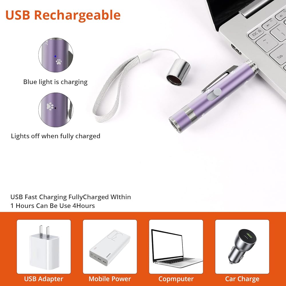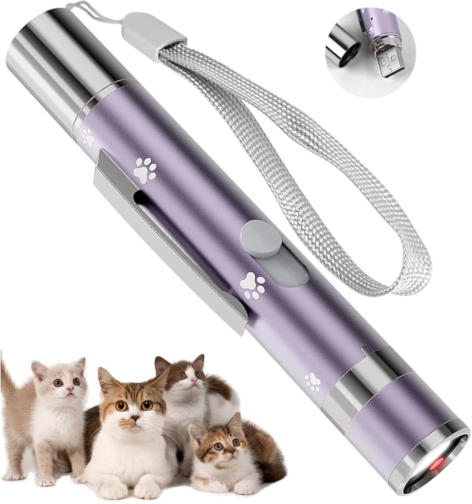 Multi-Functional & Versatile: Not just a pet toy, this red light pointer cat toy doubles as a presentation pointer with a bright, clear beam. Press the button once to activate—no need to hold it down. It also includes a glow-in-the-dark mode and a purple light mode, perfect for detecting counterfeit money or adding fun to your presentations.