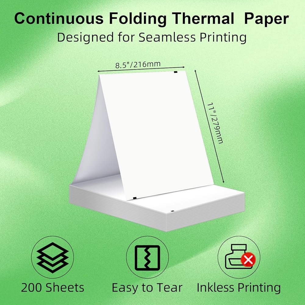Bagana Thermal Printer Paper 8.5 x 11, 200 Sheets US Letter Size Quick-dry Fan-folded Continuous Inkless Thermal Printing Paper for Portable Wireless Printer