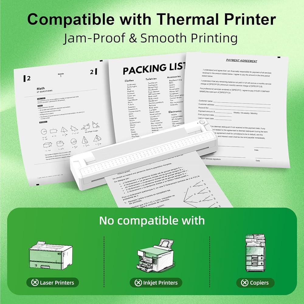 Wide Compatibility: This thermal printing paper is compatible with Bagana, Meihengtong, COLORWING, Jadens, Munbyn, Phomemo, Brother and more letter wireless thermal printers. Note: This thermal printing paper is not compatible with laser printers/inkjet printers/copiers.