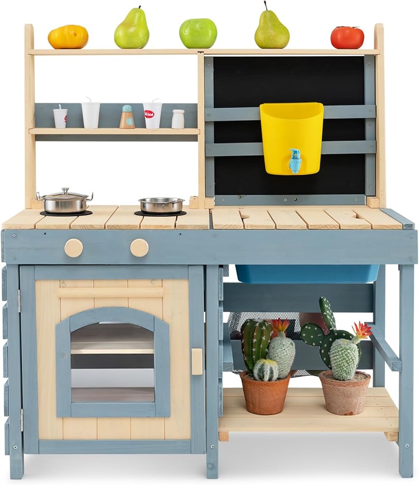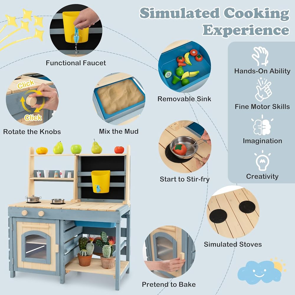 【Perfect Gift for Your Kids】: This wooden outdoor kitchen for kids that provides a realistic cooking experience, is a perfect gift for kids ages 3+ years old to spark creativity and boost social play. Your kids can wash vegetables and fruits, cook dishes with rich accessories, and turn the rotary knob with sound effects. Product Dimension: 23" x 22" x 34" (L x W x H); Counter Height: 19"