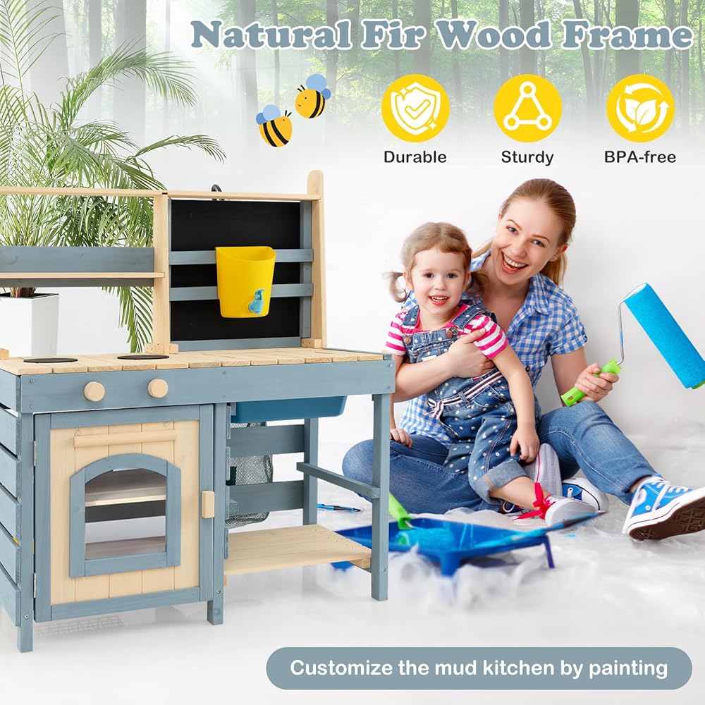 【Natural Fir Wood Frame】: Crafted from premium natural fir wood, this 2-in-1 outdoor kids kitchen playset not only looks charming but also withstands the test of time and play. The solid structure, splinter-free surface, and curved edges ensure it is safe and suitable for young children, making it a reliable addition to your child's play area.