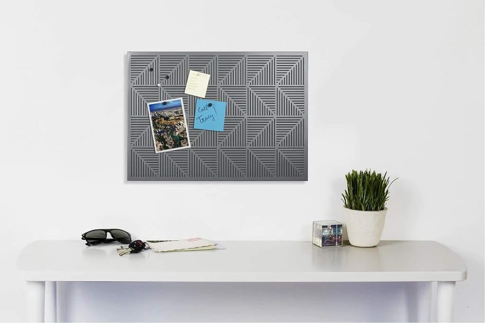 Created by Erik Man and Moe Takemura for Umbra, Trigon's perforated metal surface has a geometric pattern design that provides access to a EVA foam panel beneath - allowing you to hang items on it using both magnets and push pins.