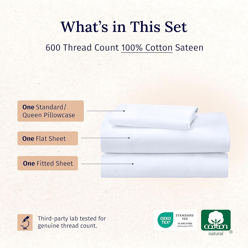 Luxury Cotton Experience - Enjoy the softness of our certified 600 thread count sateen 100% cotton sheets, providing a modern and sleek five-star hotel experience in your own bedroom. Our luxury bright white queen cotton sheets set keeps you cool and comfortable in all seasons.