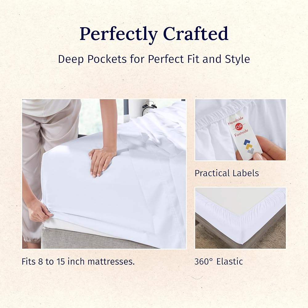 Perfect Fit Design - This 4-piece queen deep pocket cotton sheets set includes 1 flat sheet (90"W x 102"L), 1 deep pocket queen fitted sheet (60"W x 80"L), and 2 pillowcases (21"W x 32" L) that fit standard and queen size pillows. The bottom fitted sheet of our bedding sheets & pillowcases has an all-around durable elastic to fit mattresses 8 to 16 inches deep, and a head side / foot side indicator for easy bed making.