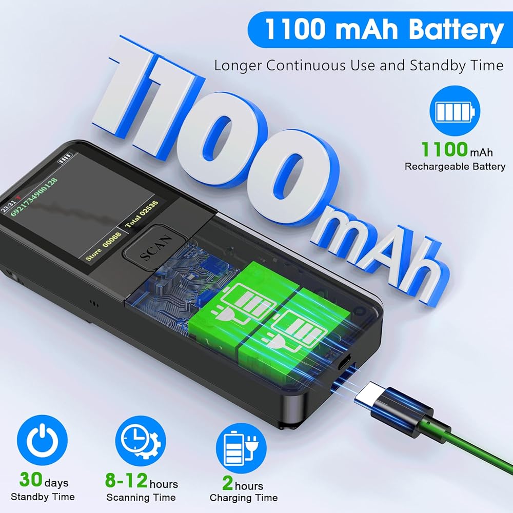 6. 1100mAh rechargeable battery can use up to 5H continuous scanning time, only need 2H to charge. Standby time is up to 30days.