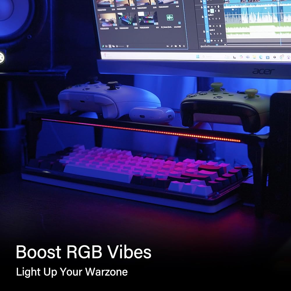 Battlestation Organization - This 1-tier desk stand elevates your gaming setup with plenty of room for your full-size keyboard, Xbox, PS5, or any media player below. Top shelf showcases figures and controllers, keeping everything organized and always within reach.