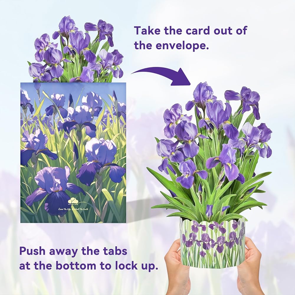 Extra Large Iris Flowers Pop-Up Cards: Our 3D greeting card, crafted from FSC recyclable paper, exemplifies our commitment to eco-conscious practices. Featuring elegant and graceful Iris bouquets in bloom, this gift card provides a versatile and enchanting alternative to artificial flowers, expressing love, hope, and admiration in a unique and memorable way.
