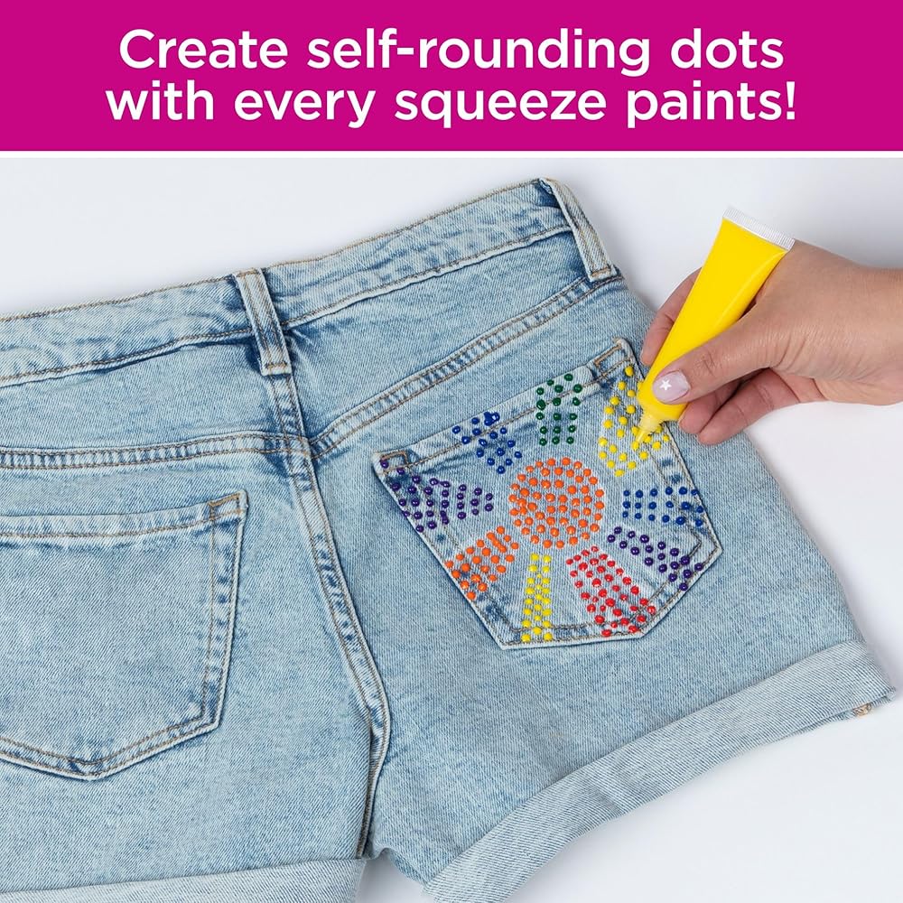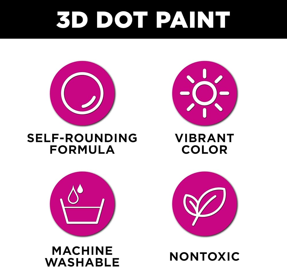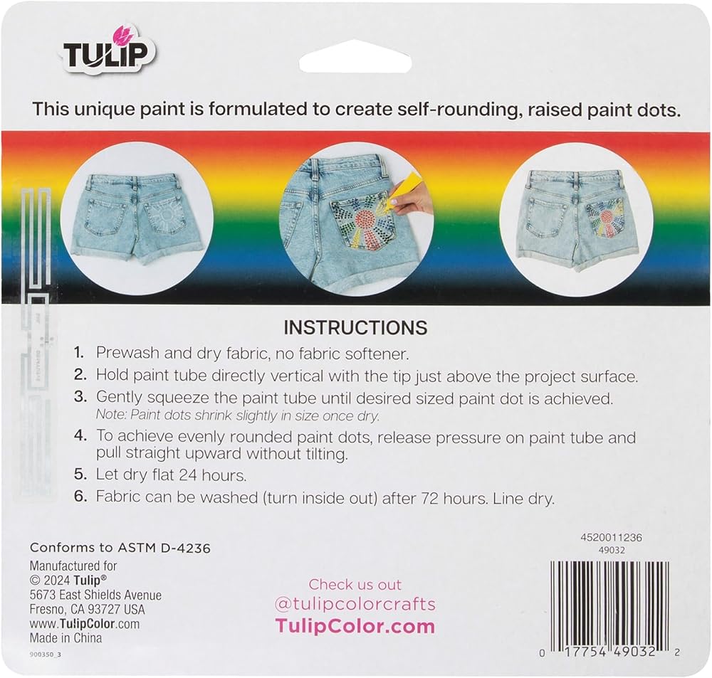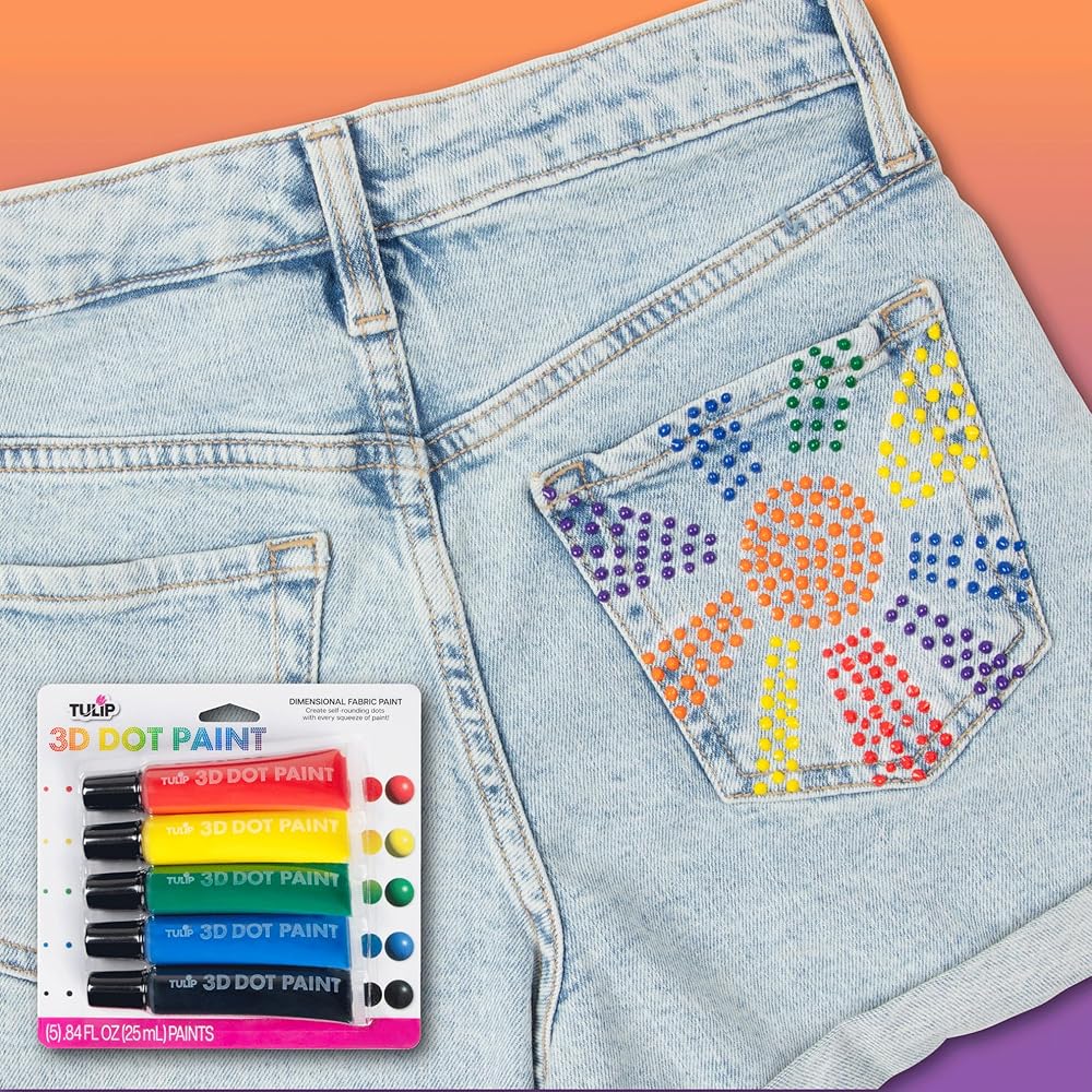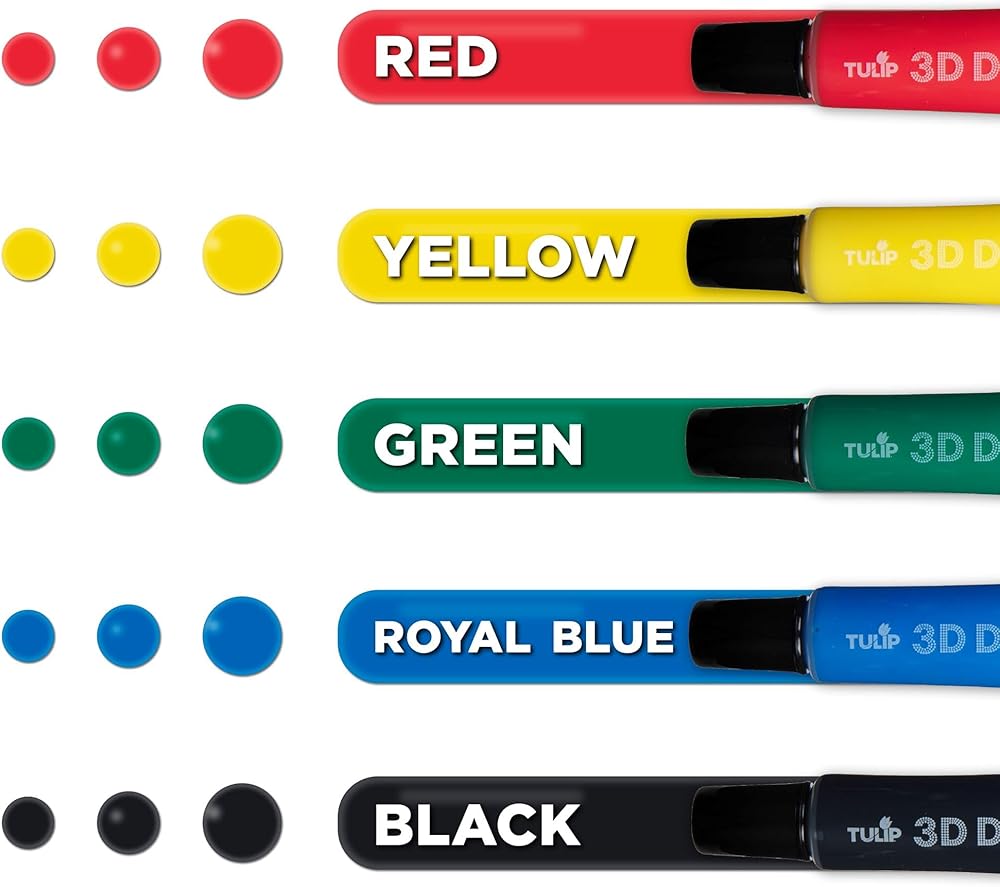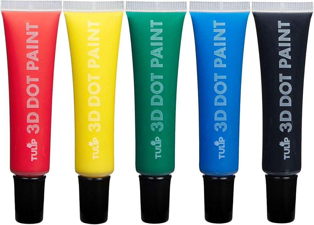Make your craft and fashion projects stand out with detailed 3D dot art! The Tulip 3D Dot Paint 5-Pack includes 5 (.84 fl. oz.) paints in an essential rainbow palette (Red, Yellow, Green, Blue, Black). Tulip 3D Dot Paint uses a unique paint formula that creates self-rounding, raised dots with every squeeze of paint!These nontoxic paints dry permanent, flexible, and machine washable with dimensional texture that stands out on every project. Try using 3D Dot Paint on everything from educational crafts to statement T-shirts, canvas art, accessories, seasonal décor, and so much more!