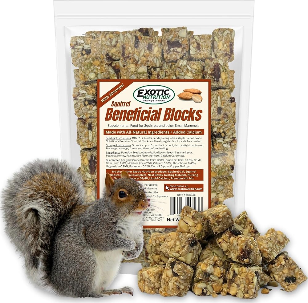 Squirrel Beneficial Blocks from Exotic Nutrition are composed of 100% all natural ingredients including natural California almonds. Fortified with calcium, they make a nutritious supplemental food option for squirrels and other small mammals. These blocks will encourage foraging behavior and serves as a source of quality protein and fiber along with minerals for a well-rounded diet. Plus, they are easy to serve and enjoyable for your pet to snack on. SIZE: Net Weight: 10 oz. FEATURES: ✔ NUTRITIOUS - These blocks provide a nutritious way to add protein and fiber to the diet✔ FORAGING - Stimulates your pet's natural urge to forage for food✔ VARIETY - Lends variety to an otherwise monotonous diet✔ DENTAL HEALTH - Provides good exercise for teeth and jaws✔ ENRICHMENT - Adds behavioral enrichment for animals that spend their lives in a small, limited environment. ✔ BONDING - Forms a connection between pets and pet owners, assisting in bonding and training. Ingredients: pumpkin seeds, almonds, sunflower seeds, sesame seeds, peanuts, honey, raisins, soy flour, apricot, calcium carbonate. Guaranteed Analysis: ccrude protein 22.0% (min), crude fat 38.0% (min), crude fiber 9.0% (max), moisture 7.5% (max), calcium 0.7%, phosphorus 0.45%, magnesium 0.29%, potassium 0.72%, zinc 49.0 ppm, copper 18.0 ppm. Calories: 5.8 kcal/g. Feeding Instructions: Offer 1-2 blocks per day along with Squirrel Complete. Always provide fresh, clean drinking water Storage: Store cool and dry. Keeps for 6 months, or refrigerate or freeze for longer storage. Thaw before feeding if you freeze the product.