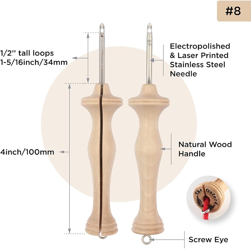 Available Sizes: The Oxford Punch Needles come in two popular needle types - regular points for bulky or rug yarn, and fine points for thinner, worsted-weight yarn. Natural Wood Oxford Punch Needle fine points come in size 8, 9, 10, 13, and 14. By using these high-quality punch needles, you can greatly enhance your creativity and craftsmanship.