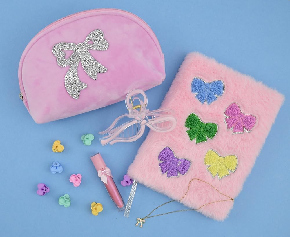 This soft, plush journal features pretty, colorful chenille bow appliques with glitter and embroidered accents
