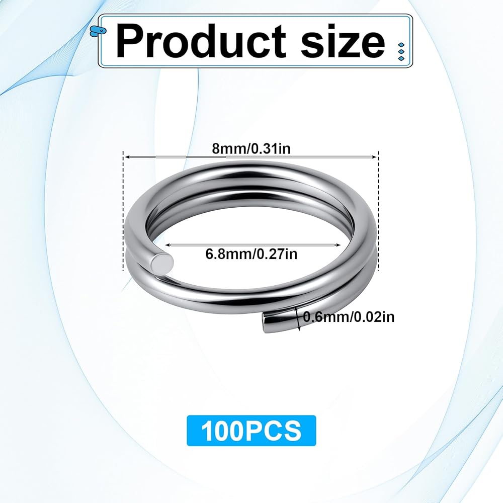 【Package Includes】You will receive 100 pack of silver tiny split key ring,which outter dia. 8 mm,inside dia. 6.8mm,wire thickness 0.6 mm.The wire loops have sufficient tension and can easily restore to their original shape, whether you use it to make DIY crafts, accessories, etc., it is the best choice!