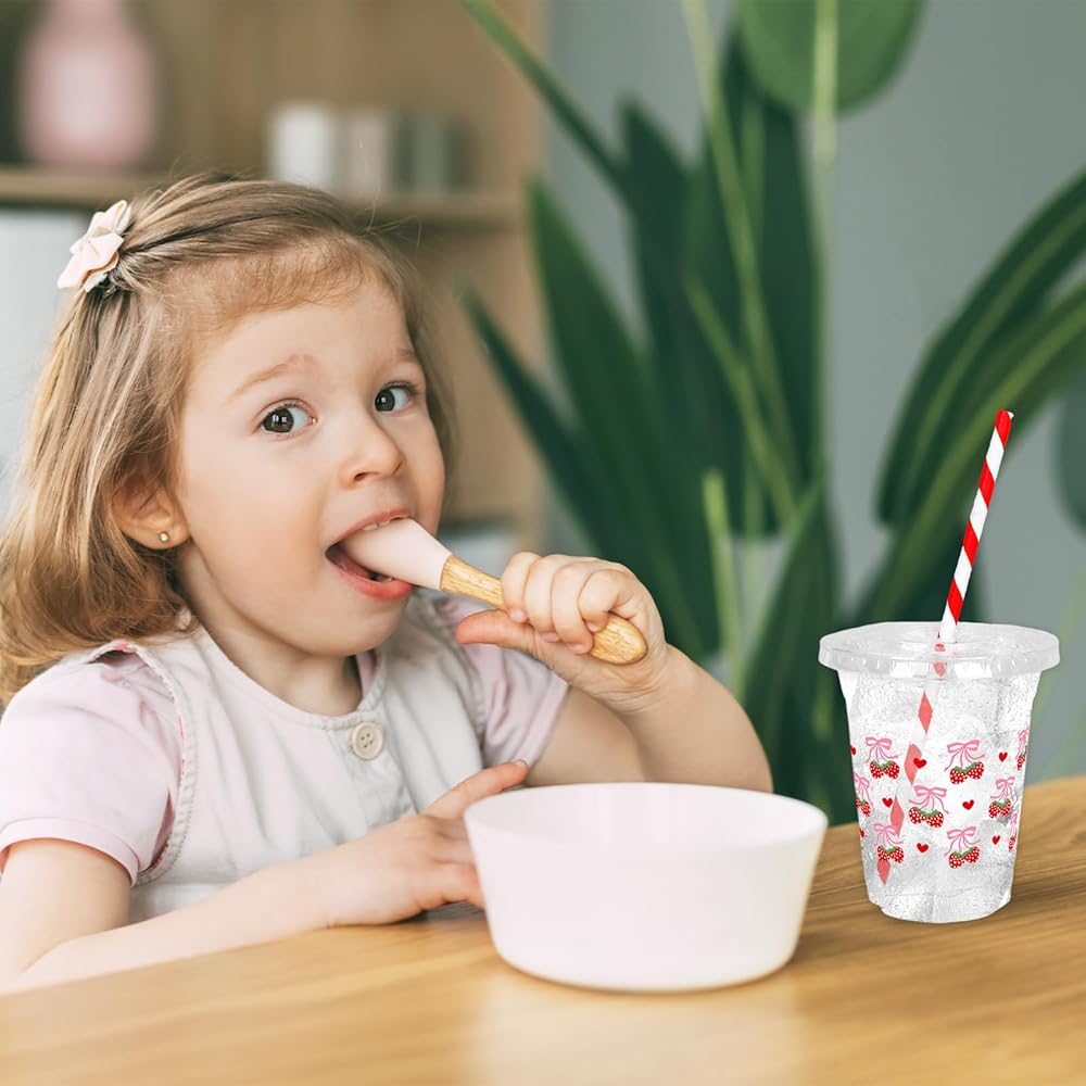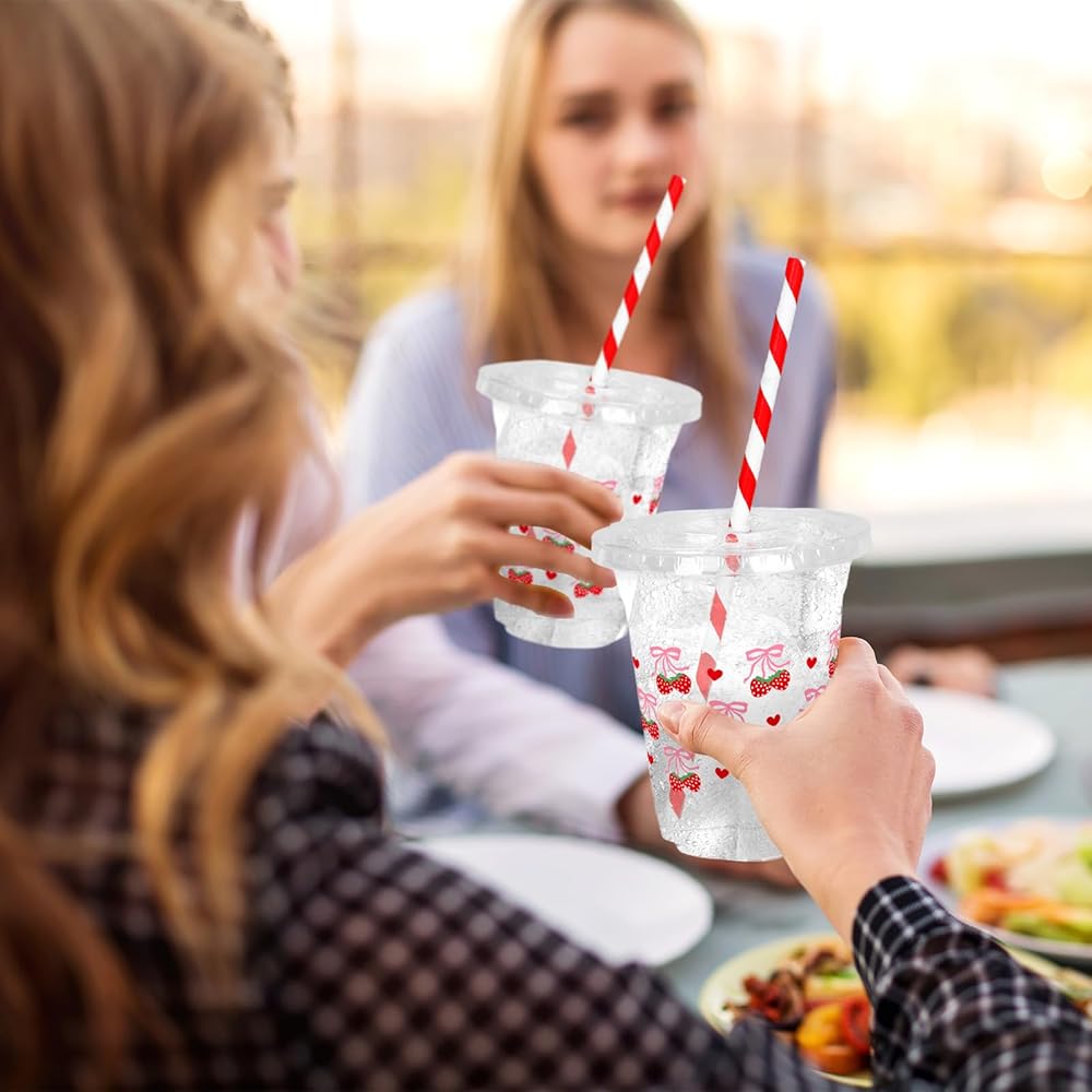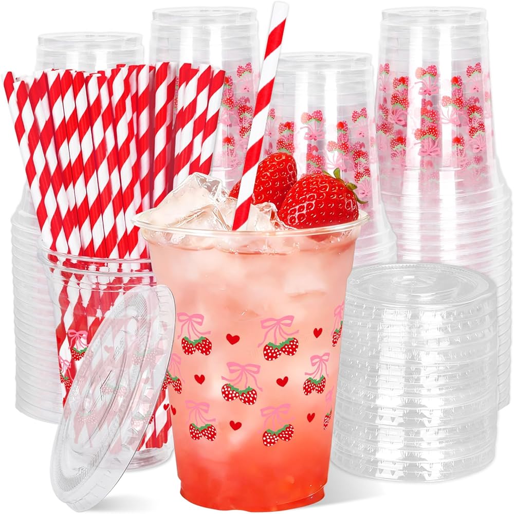 TRENDY DESIGN: Our clear cups with lids and straws are printed with pink bow and heart patterns, pretty and stylish, full of aesthetic style, matching straws are in pink and white stripe design, all people will love these lovely cups set