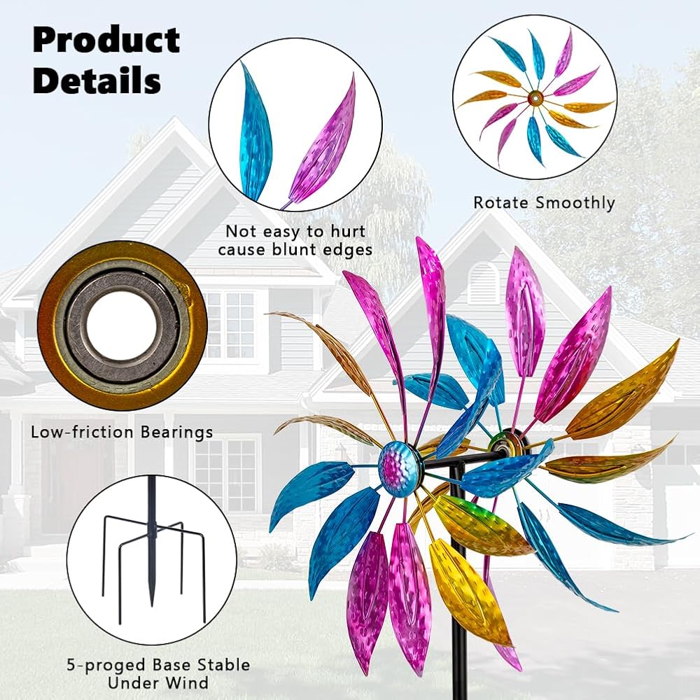【Waterproof & Durable】Garden wind spinners is 63.6” high and 14.6” in diameter. The entire pinwheels is made of high-quality metal material and has undergone waterproof and rust proof treatment, making spinner less prone to rusting or fading. It can be used in most weather conditions.