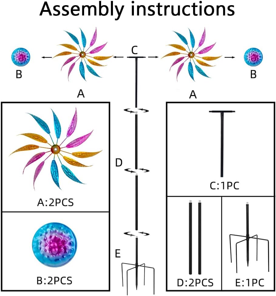 【Easy to Install】The installation of wind spinners for yard and garden is very simple, just tighten the various components of wind sculptures & spinners in order. And you can also adjust the height of large wind spinner according to the number of installed poles, thus meeting the decoration needs of different scenes.