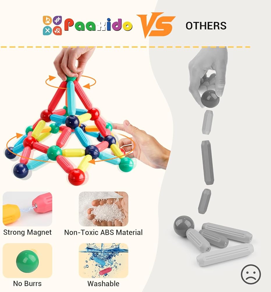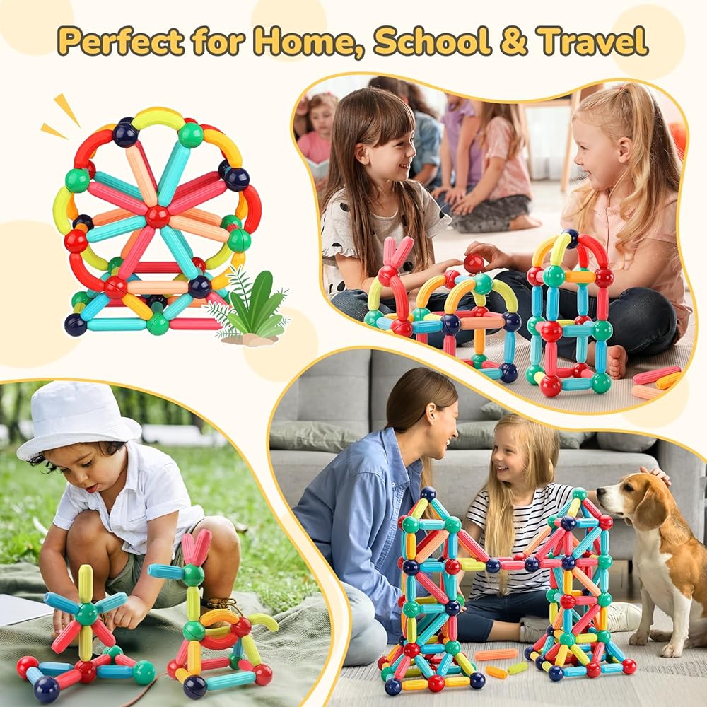 VERSATILE BUILDING EXPERIENCE: Create endless possibilities with this expanded set of magnetic rods and balls. Perfect for both beginners and advanced builders, allowing children to progress from simple shapes to complex architectural structures. The stronger magnets ensure creations stay intact, reducing frustration and encouraging longer play sessions