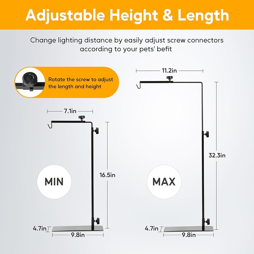 Convenient Free Adjustment: The height of the lamp stand can be adjusted: about 16-32 inch, the hook cantilever telescopic range: about 7-11inch. You can freely adjust the distance and position of the heat and light to make your pet comfortable