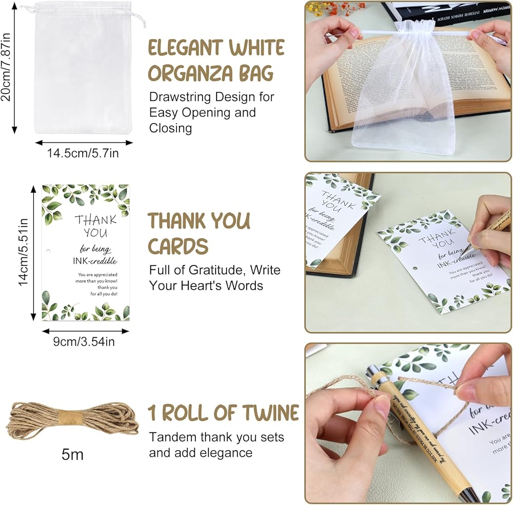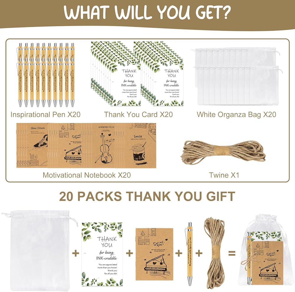 Packing List: Our employee appreciation set includes 20 pieces of inspirational pens,20 pieces of thank you cards,20 organza bags and 1 roll of twine.Can be used as a thank you gift to employees,teacher,Coworker, the perfect expression of gratitude.