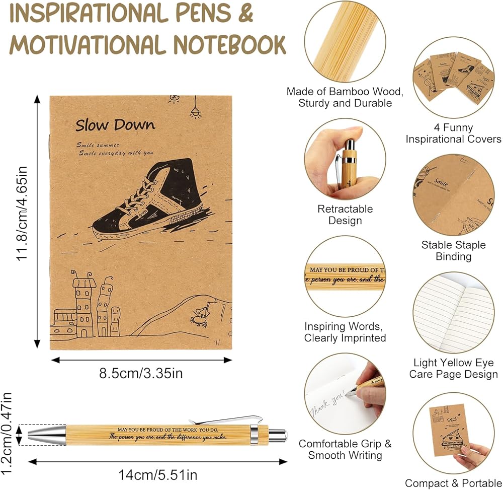 Exquisite Design: The motivational pens are mainly made of bamboo wood, safe and strong, not easy to break or fade, and can ues for a long time.The thank you cards are mainly made of coated paper, printed with clear pattern and grateful phrases.Secure with string,leaving a deep appreciation.