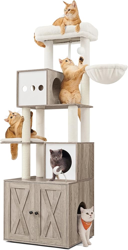 [Climb. Observe. Scratch] This cat tower boasts a multi-level design for easy climbing, a top perch for them to observe their domain, and multiple scratching posts to satisfy their natural instincts
