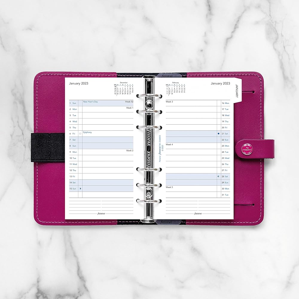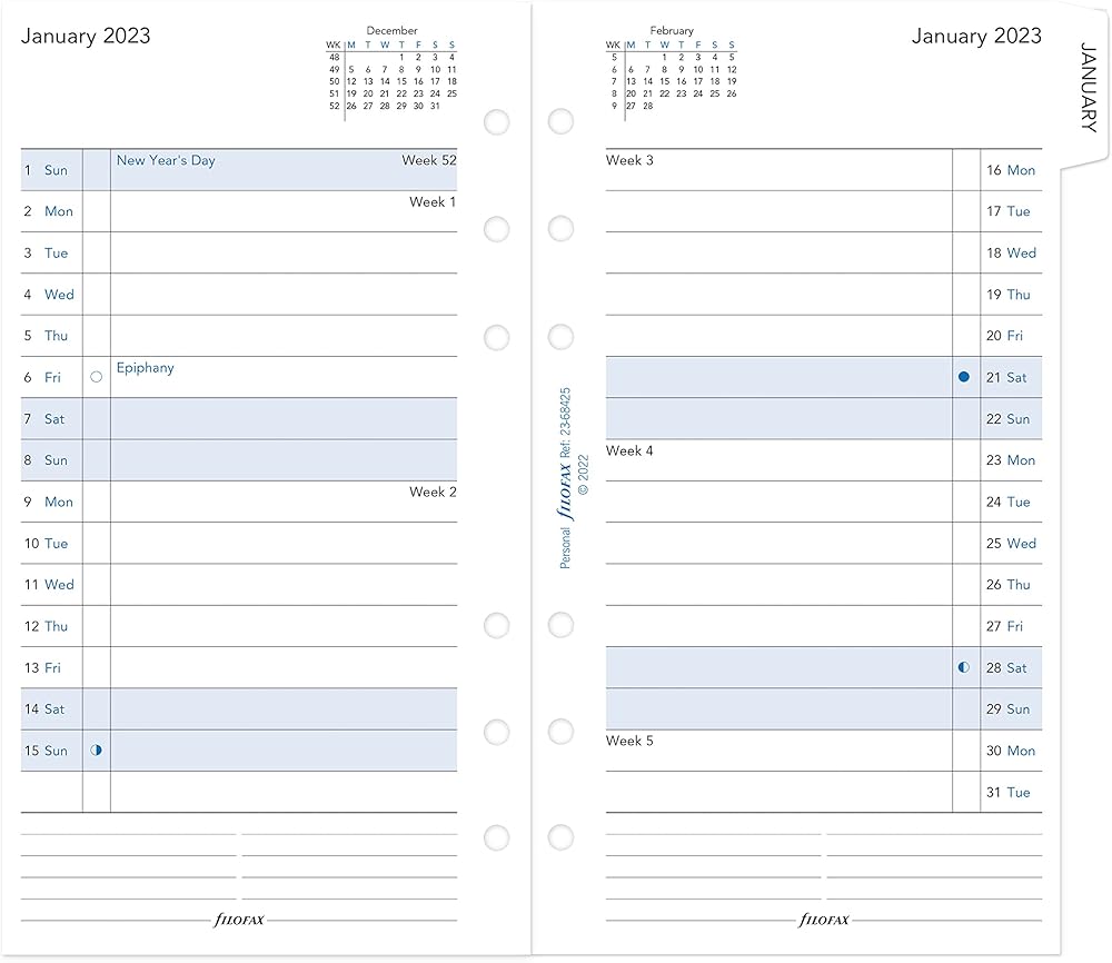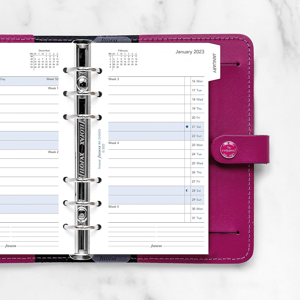 Organize life a month at a time with this personal/personal compact month on two pages diary with tabs. Calendar Diary Refill features: Month-to-View (MTV), Month on two pages, January to December, 2025. Ruled, white 120 gsm fountain pen-friendly paper. 22 sheets printed with black and blue ink. Monthly dated refill is personal/personal compact size for planners, organizers, agendas and diaries. English. Paper sourced from sustainable and internationally accredited resources. Over the years, the Filofax organizer has evolved from a simple loose-leaf system into an indispensable everyday accessory. The Filofax logo promises authenticity and the finest craftsmanship. It's a hallmark of impeccable quality, trusted worldwide, since 1921.
