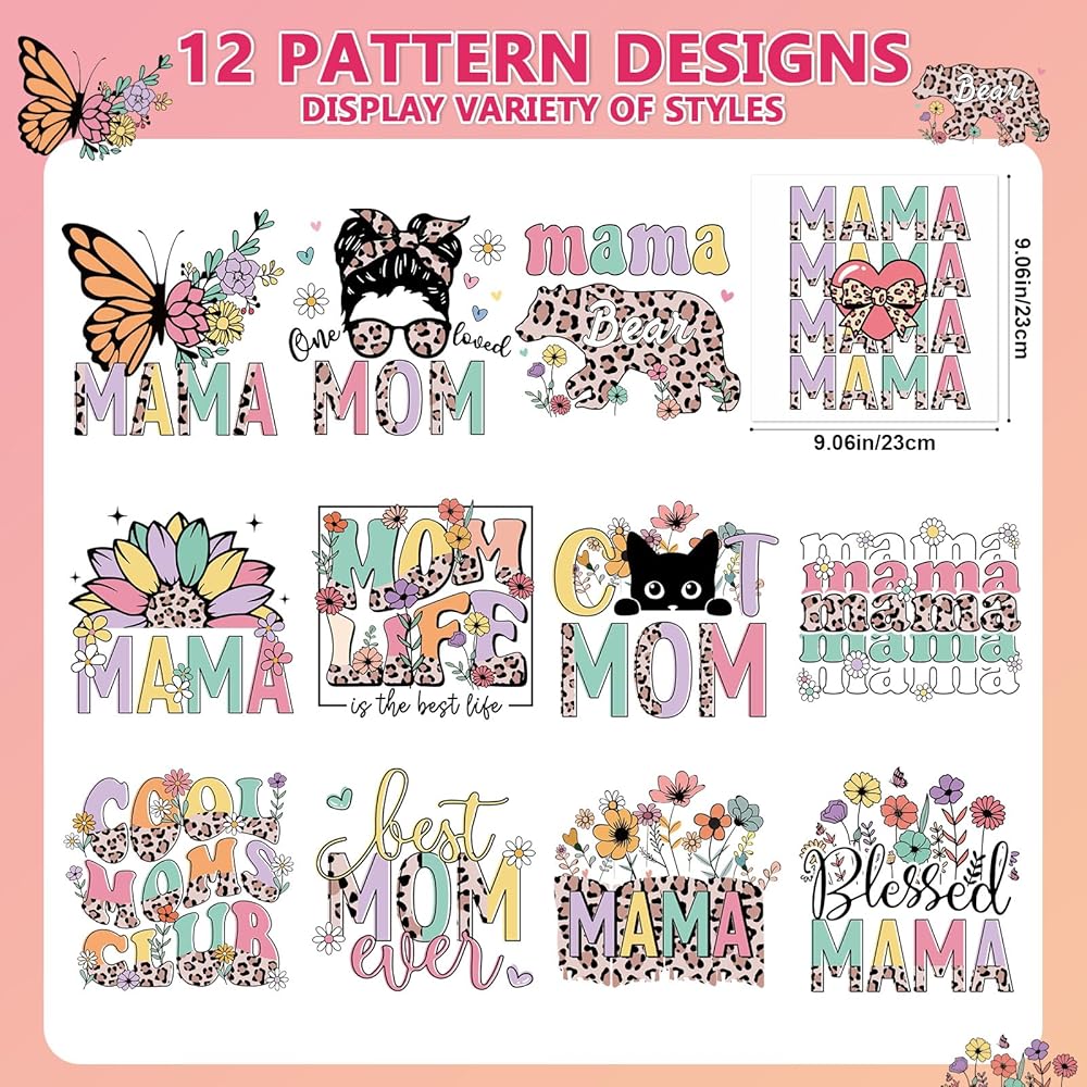 Dtf Transfers Ready to Press - 12Pcs Leopard Mama Iron on Transfers for T-Shirts, Cat Mom Iron on Decals Patches, Mothers' Day Heat Transfer Stickers for Clothes Bag Hats Pillow DIY Supplies