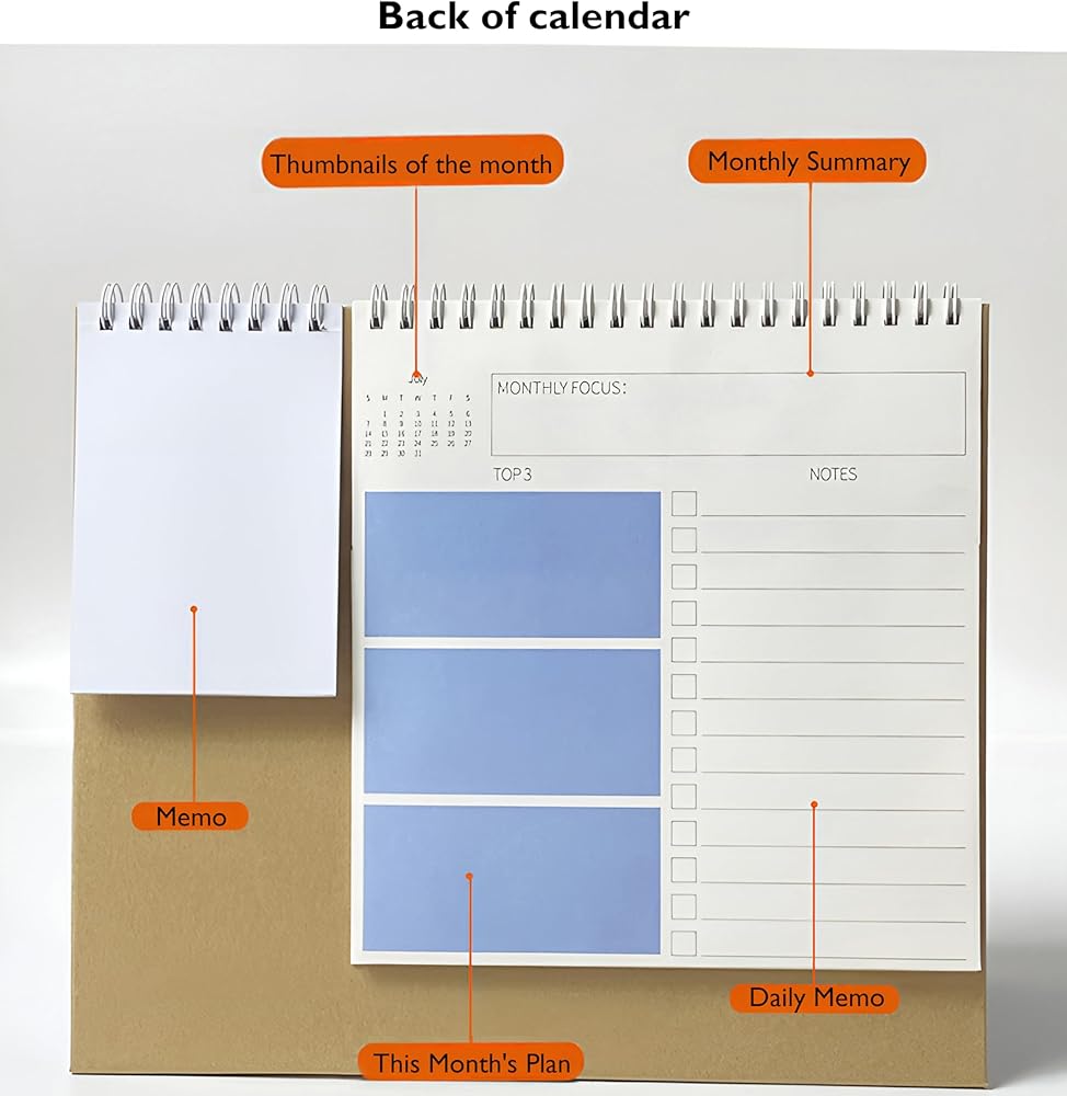 MONTHLY PLANNING:The monthly spread of this desk calendar features this and next month reference for your long-term planning. Also, there is thumbnail of the this month on the other side of memo page, you can jot down your monthly planing ,monthly focus and top matters.