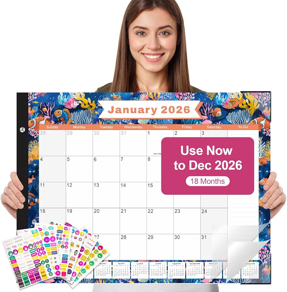 Gannyfer 2026 Desk Calendar, 18-Month Large Desk Calendar, Use Now Until Dec 2026, 22" x 17" Desktop Pad Calendar for Planning and Organizing Your Family, School, and Office - Blue, (Includes 6 Stickers)