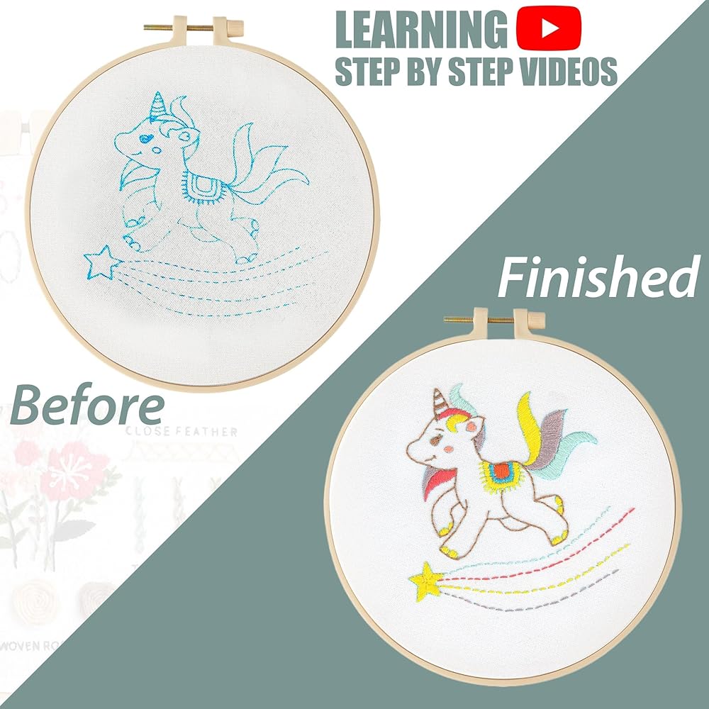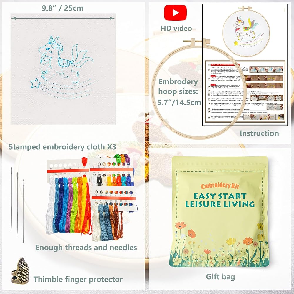 Complete DIY Embroidery Kits: Everything You Need in One Package! This all-inclusive kit has it all: 3 pre-printed fabric pieces in a variety of colors, 21 vibrant embroidery threads, 9 needles, 2 bamboo hoops, a needle threader, a seam ripper, and a detailed instruction booklet and there are video tutorials for each pattern. Perfect for both beginners and experienced crafters, it offers a complete and satisfying DIY experience.