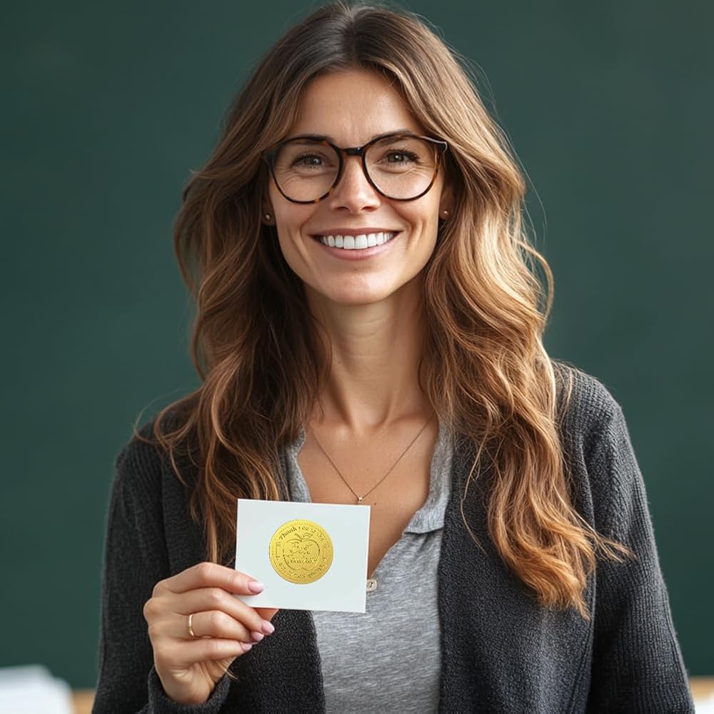 Peacoblue Gold Foil Sticker Seal Embossed 2 Inch 100Pcs Apple and Best Teacher, Self Adhesive Gold Around Embossing Medal Sticker for Certificate Paper, Student Reward, Award, Envelope Seal