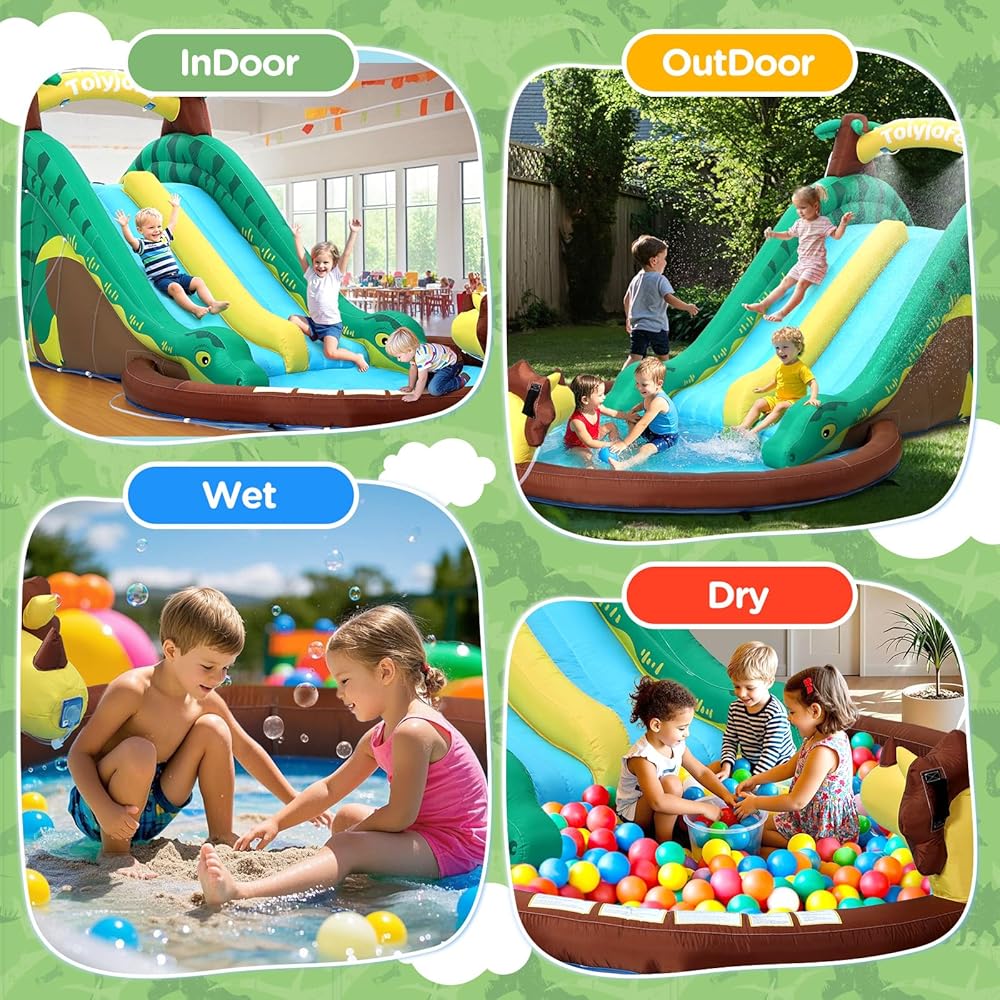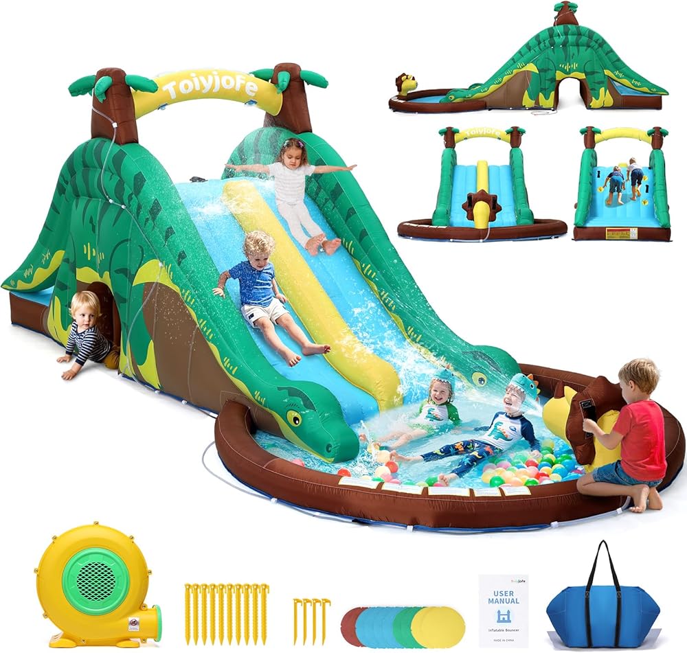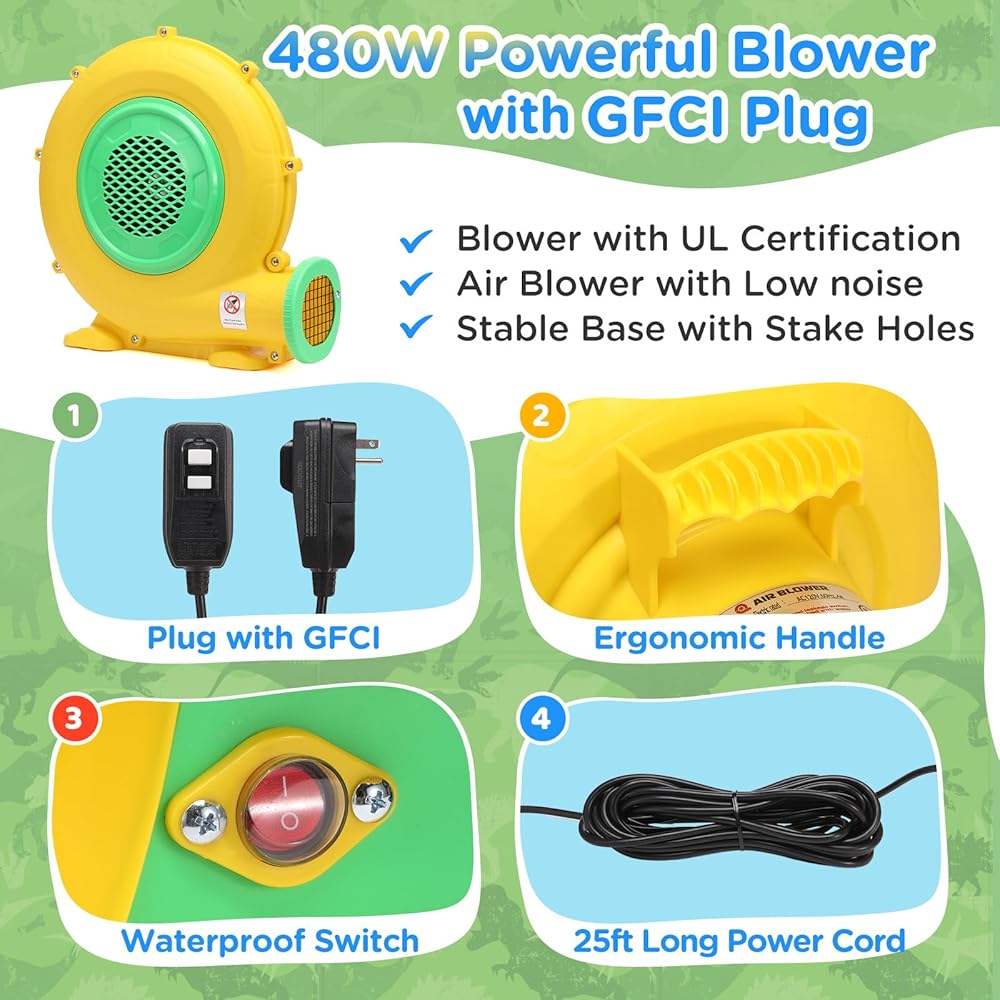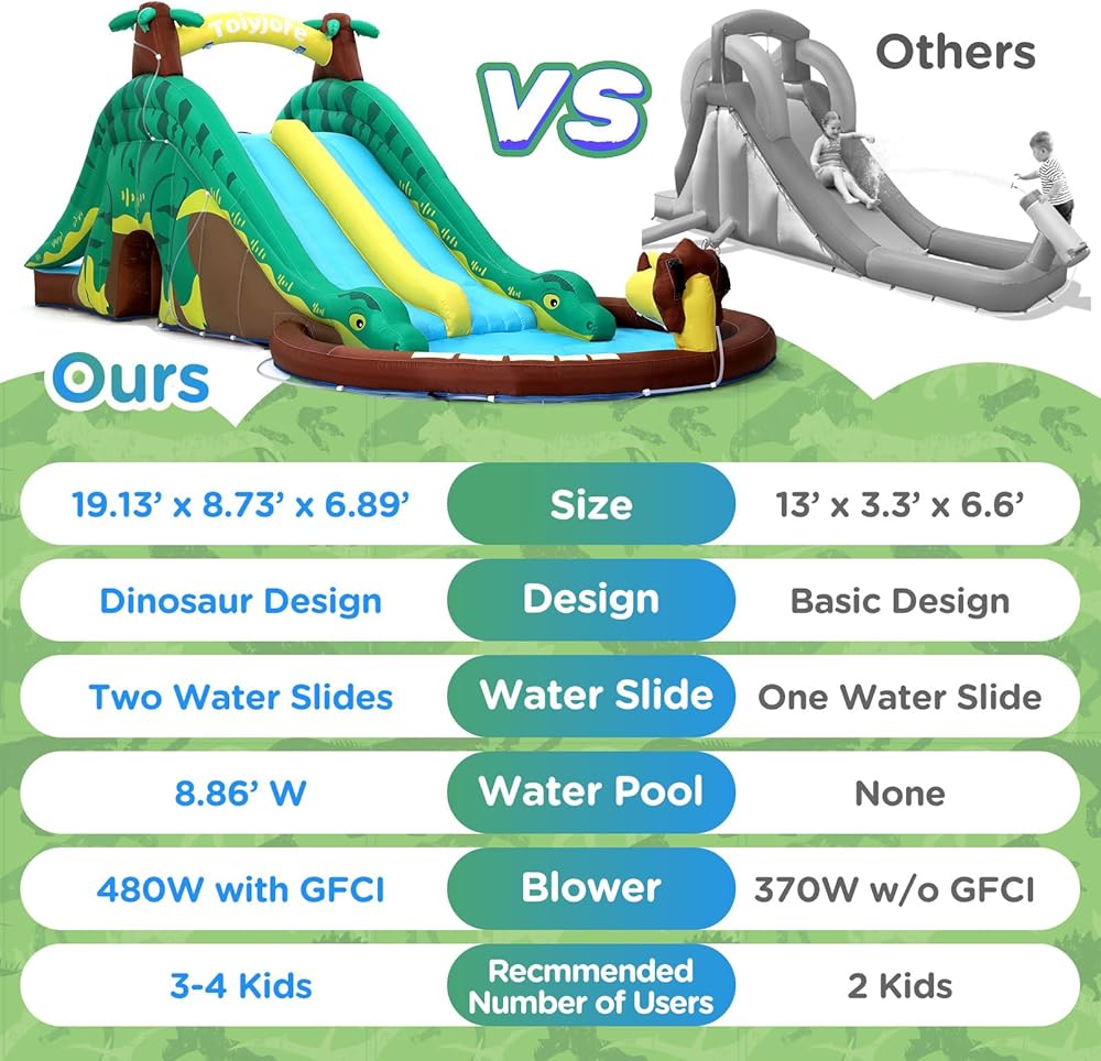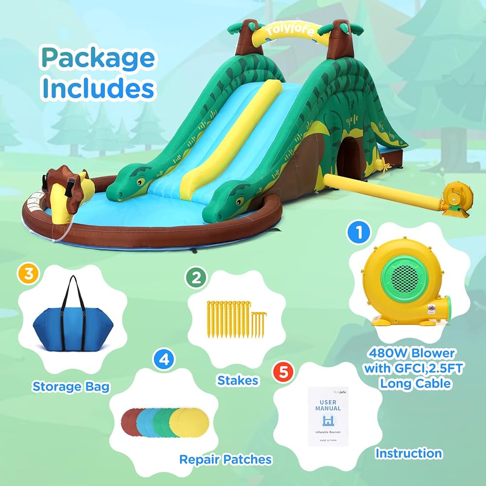 Dinosaur Bounce House Water Slide, Bouncy House Castle with Splash Water Pool 480W Blower with GFCI Dinasour Water Bouncing House with Dual Slide Indoor/Outdoor Backyard Play for Kids 3-10