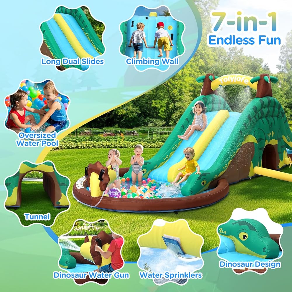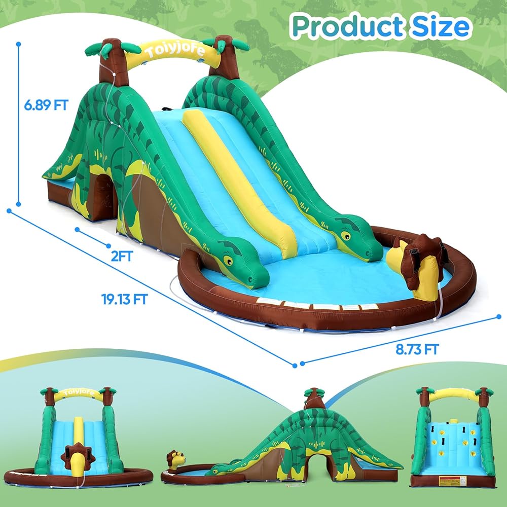🦖【Endless Summer Fun】This unique water slide features a long-necked Brachiosaurus and horned Triceratops can turn your backyard into a prehistoric playground to draw your kids away from the screen and into the outdoors. The giant inflatable covers a 19.13ft x 8.73ft space, reaches a height of 6.89 ft, can accommodate 4-6 children at a time, perfect for ages 3-12 (with a maximum weight of 99 lb for each kid), and combines various entertainment areas including the long dual slide, climbing wall, splash pool, game tunnel, 2 water cannons and a dinosaur sprinkler.