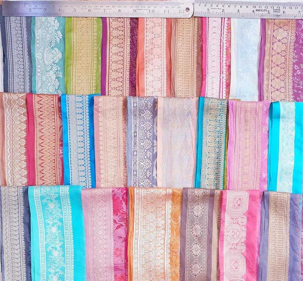 • You are bidding on a RARE LOT OF 25 pieces of sari borders. Length of each piece is 1 yard (36 inches), width varies from 1 inches to 3 inches.