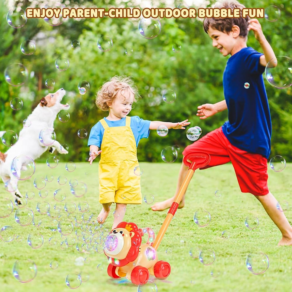AUTOMATIC BUBBLE MACHINE - This lion bubble blower offers two fun modes: push the handle for automatic bubble blowing while on the move, or use it as a handheld bubble machine for more flexibility. It's an excellent outdoor toy for toddlers and can even entertain pets. Whether in your backyard, park, grassy area, or beach, this bubble blower is a fantastic addition to any outdoor adventure.