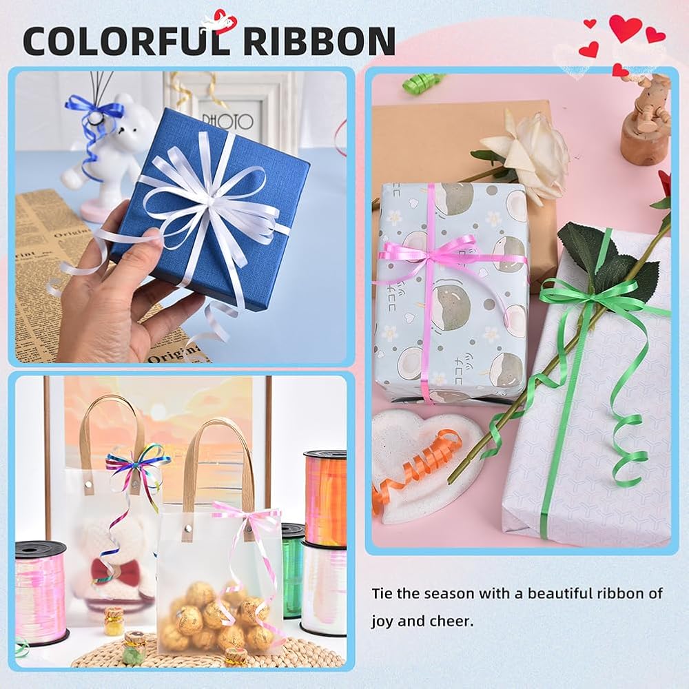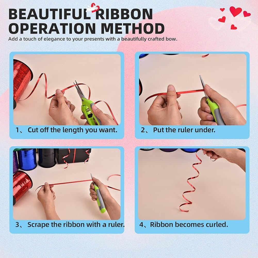 Easy to Make Curls: You could use scissors to scratch the ribbon quickly to make it curled and divide into several small strings. Or you could use surround a round pen with the ribbon to make it curled. Ideal curling ribbon for decorations, ribbon for gift wrapping, ribbons for Christmas crafts project