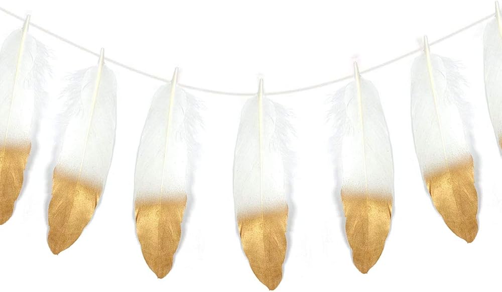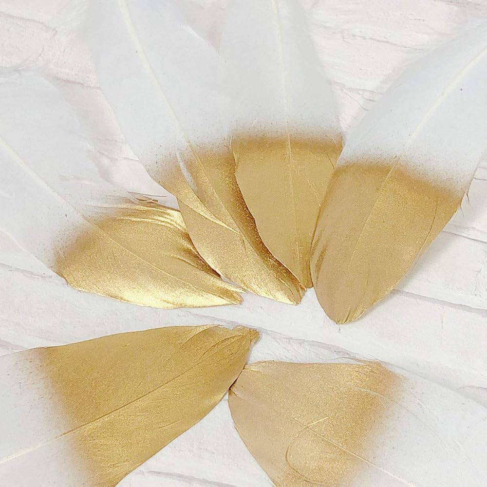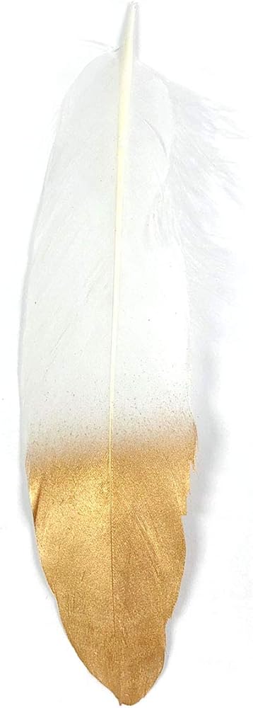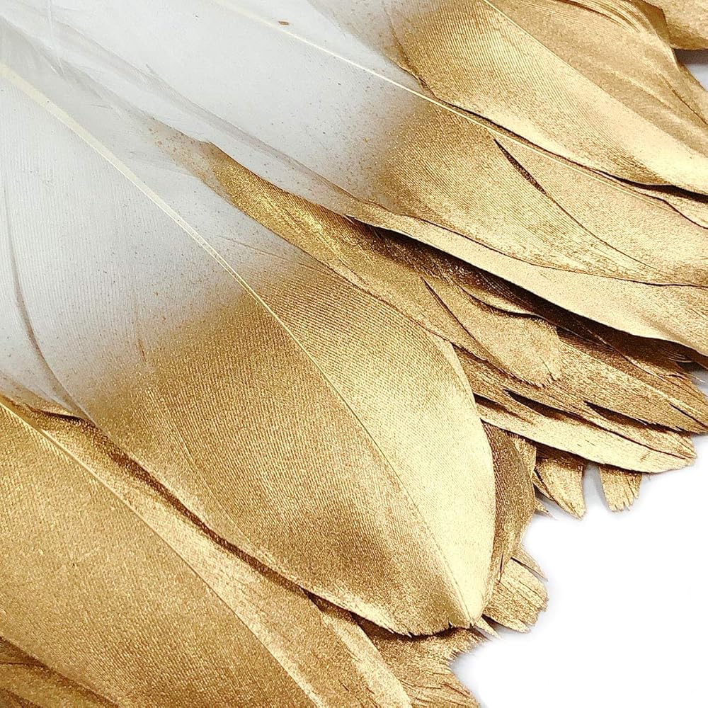 Create a Bohemian look for your event or arts & crafts projects with these gold tipped feathers. The feathers are dipped in gold paint and shine beautifully against the sunlight. Use them to make dream catchers, adorn costume and jewelry pieces, and for making garlands. They also make wonderful décor pieces: place them in a vase or bowl; hang on trees, walls, or ceilings as garlands; and more. The feathers are real feathers that were ethically obtained. Perfect for bohemian weddings, bridal and baby showers, parties, teepees, home décor, showers, and Thanksgiving.