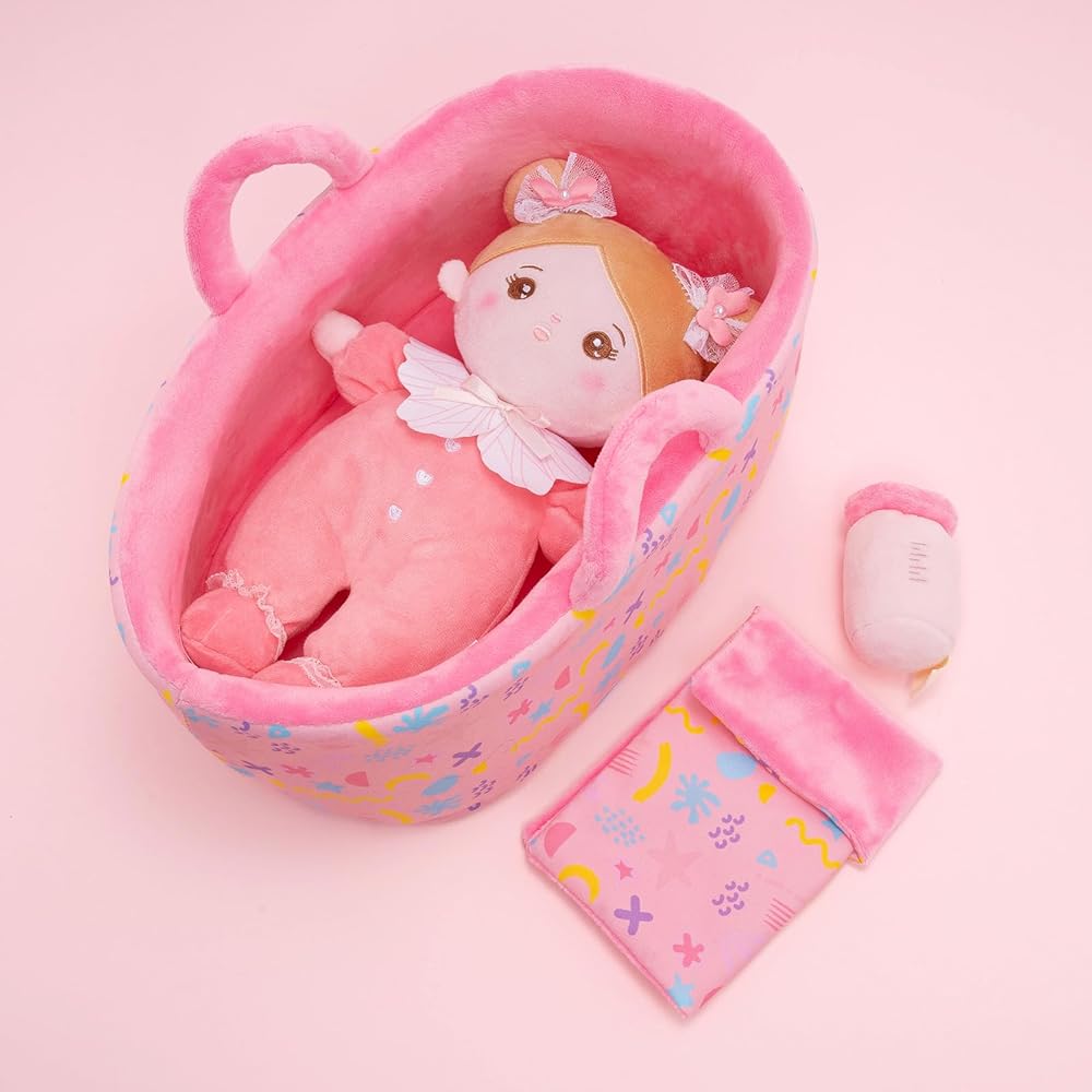 OUOZZZ 10" Baby Doll for 2 Year Old Girls Set with Soft Doll, Bassinet, Blanket and Bottle, Interactive Pretend Playset for Social Emotional Learning, Birthday Gift for 2 Year Olds Girls Pink