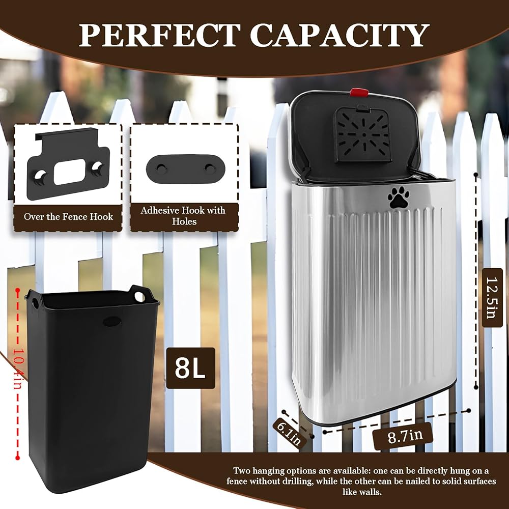 Kopuncare Dog Poop Trash Can Outside Wall Mounted, 8L Small Outdoor Trash Can with Lid, Dog Waste Trash Can Hanging on Fence, Dog Waste Container with 40 Bags, Inner Waste Bin