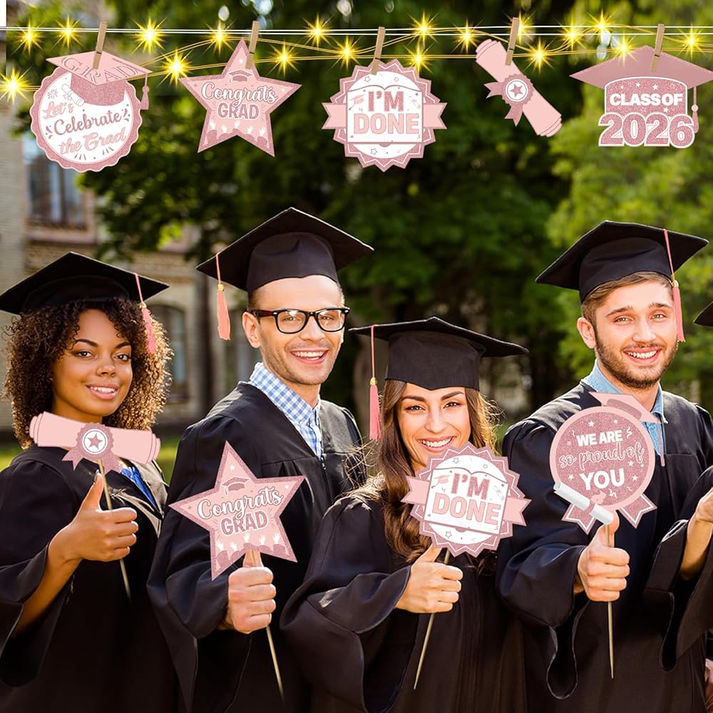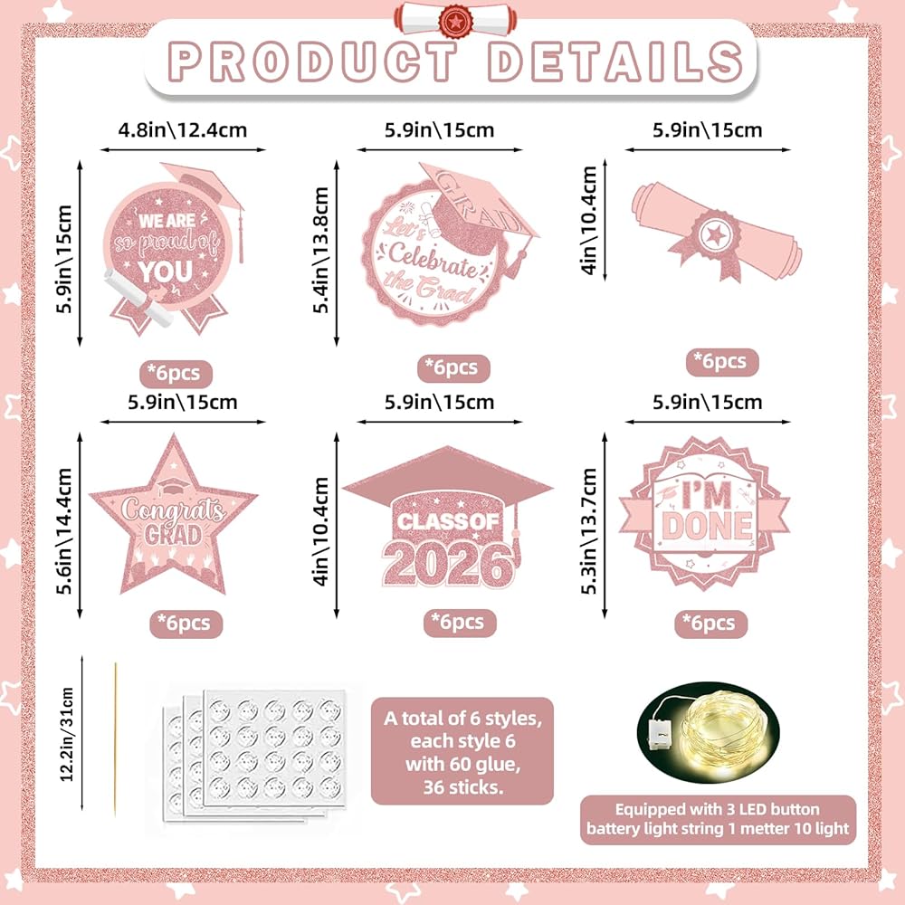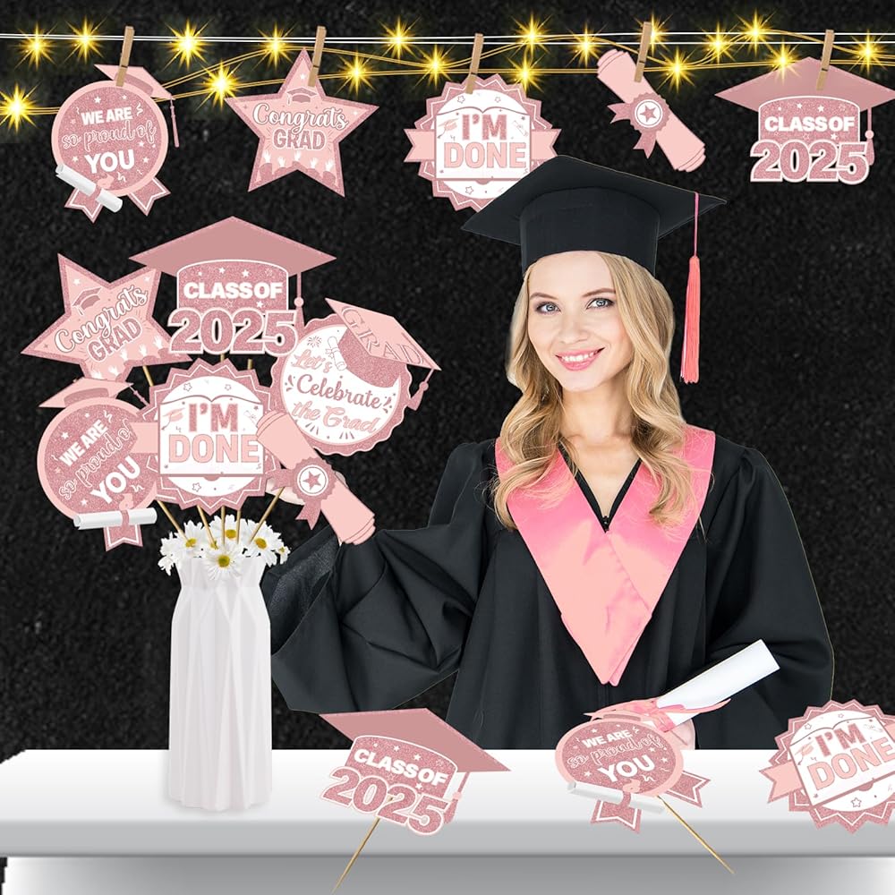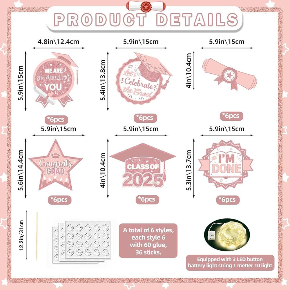 Package Include: You will receive 36pcs Pink White 2025 graduation centerpieces for tables, there are 6 style,each has 6pcs, and 1*3M LED light, supply graduation table decorations for your lovely graduation party.