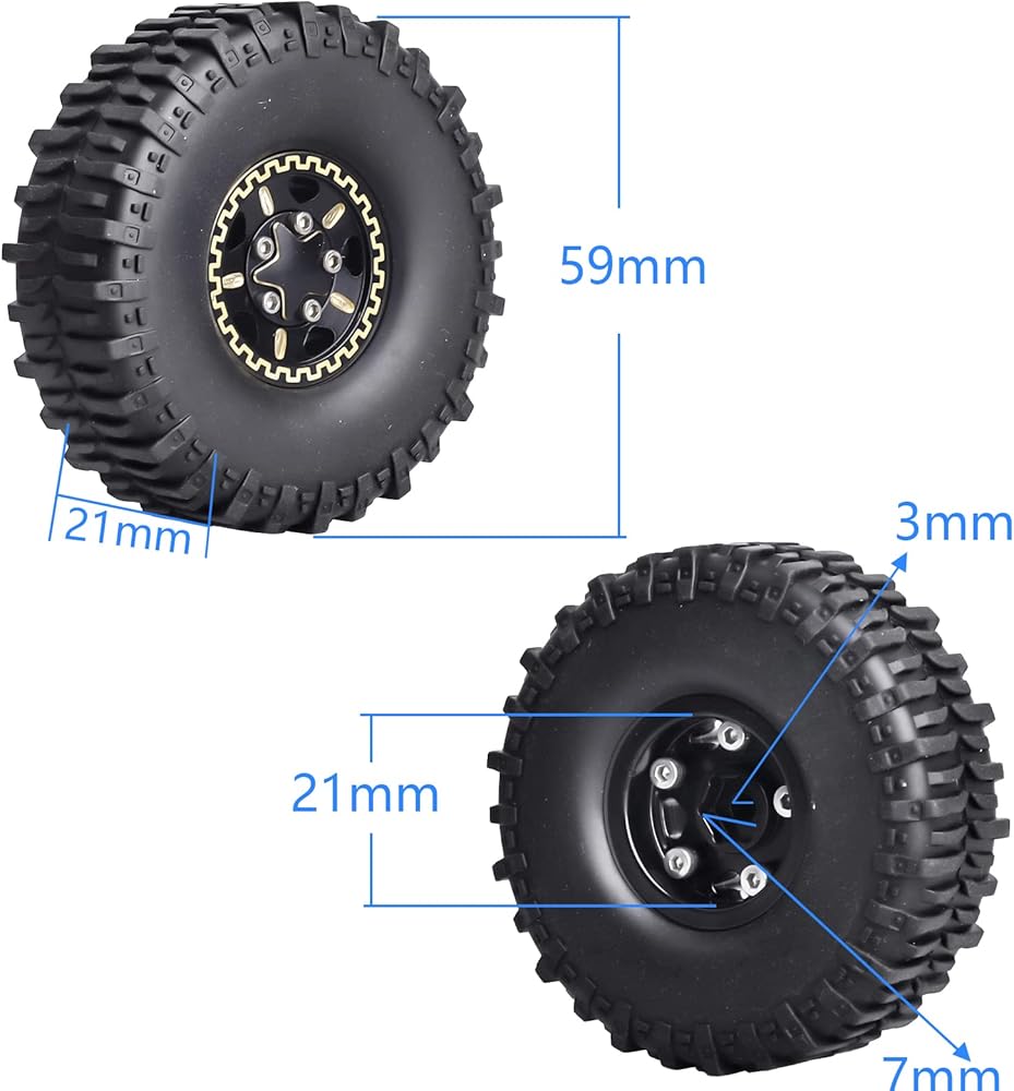 ✔Tires OD 2.05" (52mm); ID 0.83" (21mm);Width:0.75" (19mm); Axle Hole: 3mm; Wheel Hex: 7mm