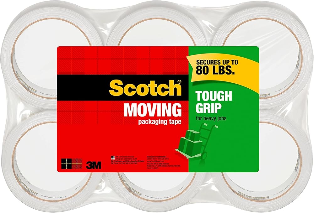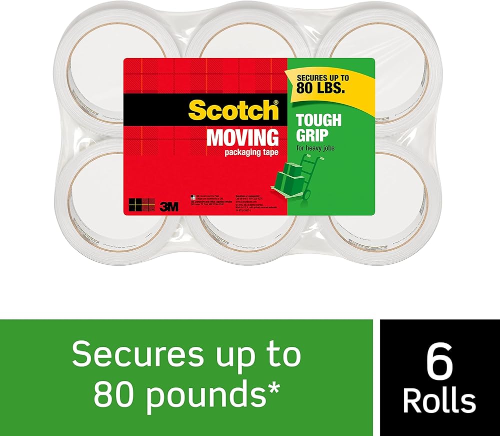 Scotch Tough Grip Moving Packing Tape helps you get a grip on big, heavyweight moving jobs. This moving tape holds strong on all box types, including harder-to-stick-to 100% recycled boxes, and is guaranteed to stay sealed (1). Designed with durable adhesive, this packaging tape secures up to 80 pounds of weight per box, even through rough handling conditions and moving truck rides. When you're packing your belongings for a big move, count on this split- and tear-resistant adhesive tape to ensure boxes stay fully packed and closed. Each roll of box sealing tape unwinds quietly and easily to make application a breeze. One package contains three rolls of packing tape that are 1.88 in. x 38.2 yd., on a 3-in. core. Scotch Brand delivers confidence in superior results to get package protection done well and effectively the first time. (1) If your box does not stay sealed, 3M will refund the purchase price of this tape. Proof of purchase required. Contact: 1-800-3MHELPS