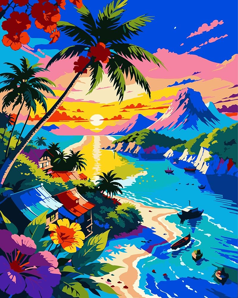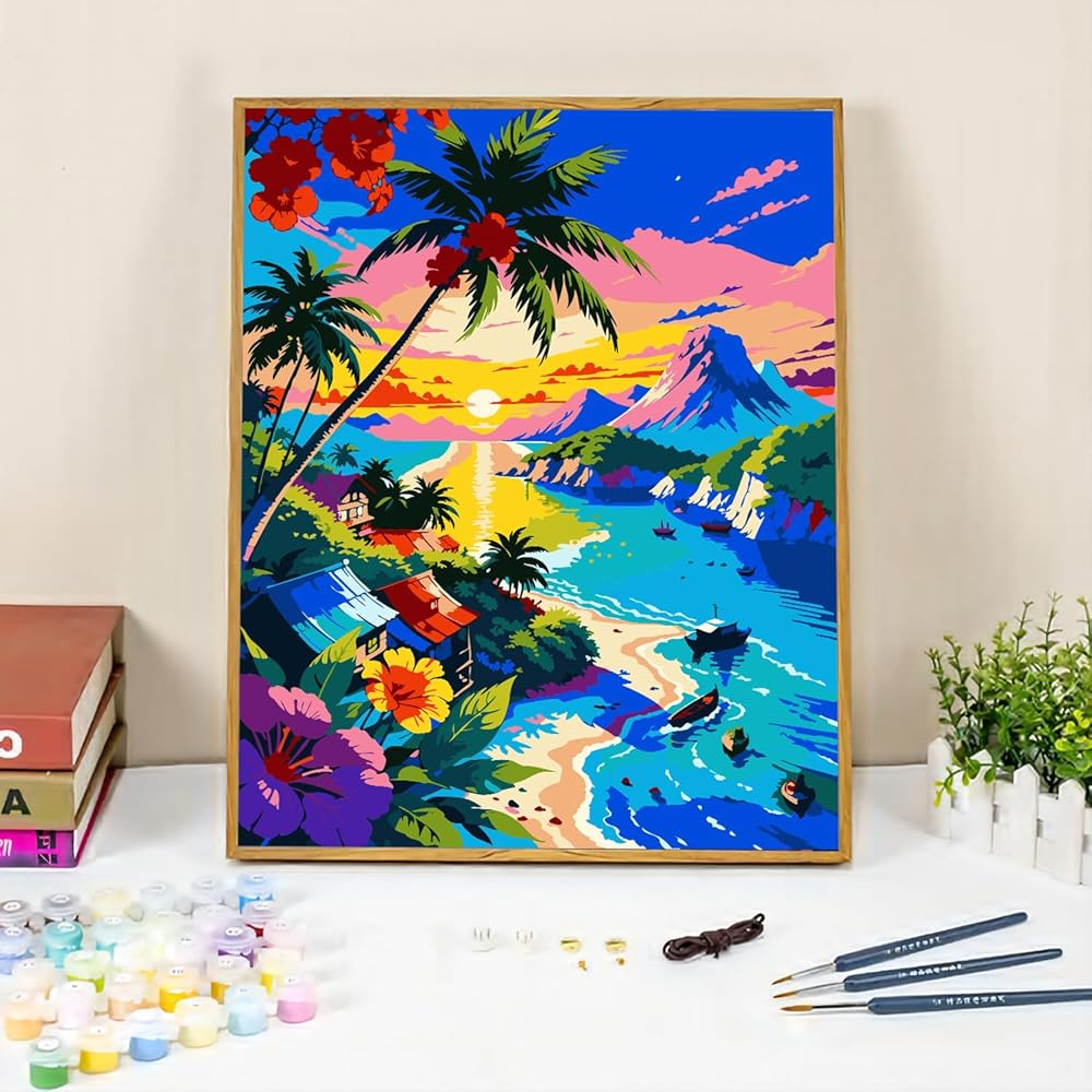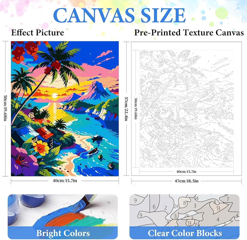 🌴【What you will get】:Our landscape adults paint by number kits contains:1 pre-printed canvas (without frame),1 set of acrylic paint,3 high-quality brushes,1 wall hanging kit,1 color postcard guide,1 paper copy of numbered canvas for reference,helping you complete paint by numbers kit for adults beginner faster.