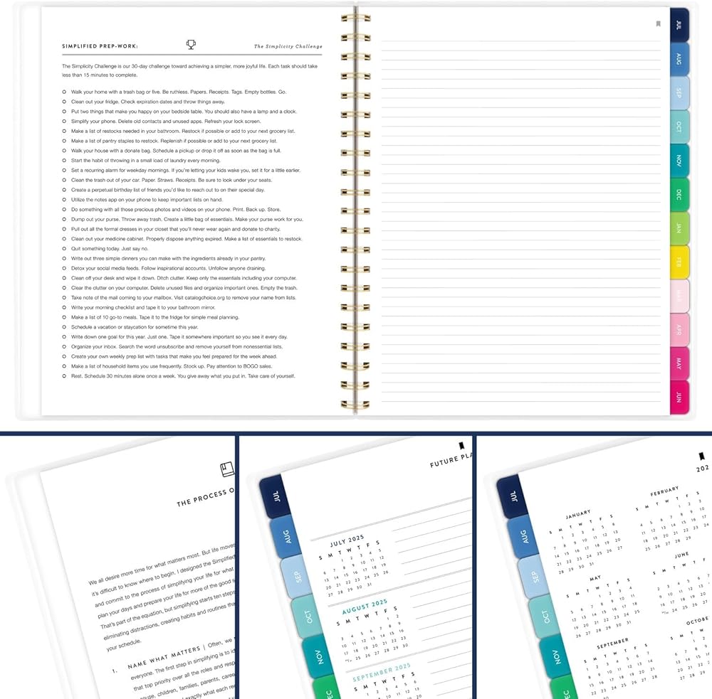 MONTHLY PLANNING – Monthly spreads have unruled daily blocks, a lined notes section and a “simplicity tip.” Months are tabbed to quickly flip to any date.