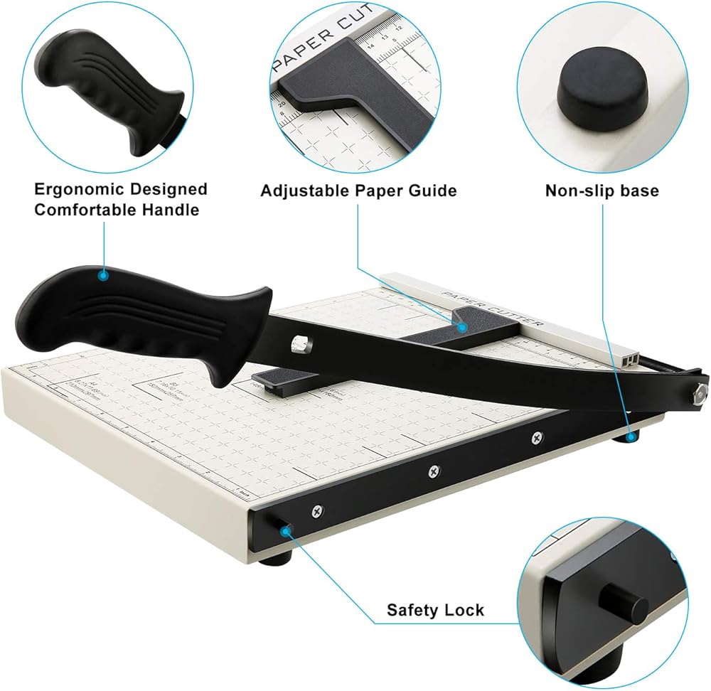【Non-Slip Heavy Duty Base】Equipped with 4 non-slip round base. Made of metal base and high-quality steel, the guillotine paper cutter effectively prevents the base from moving when cutting, ensuring more accuracy and safety.